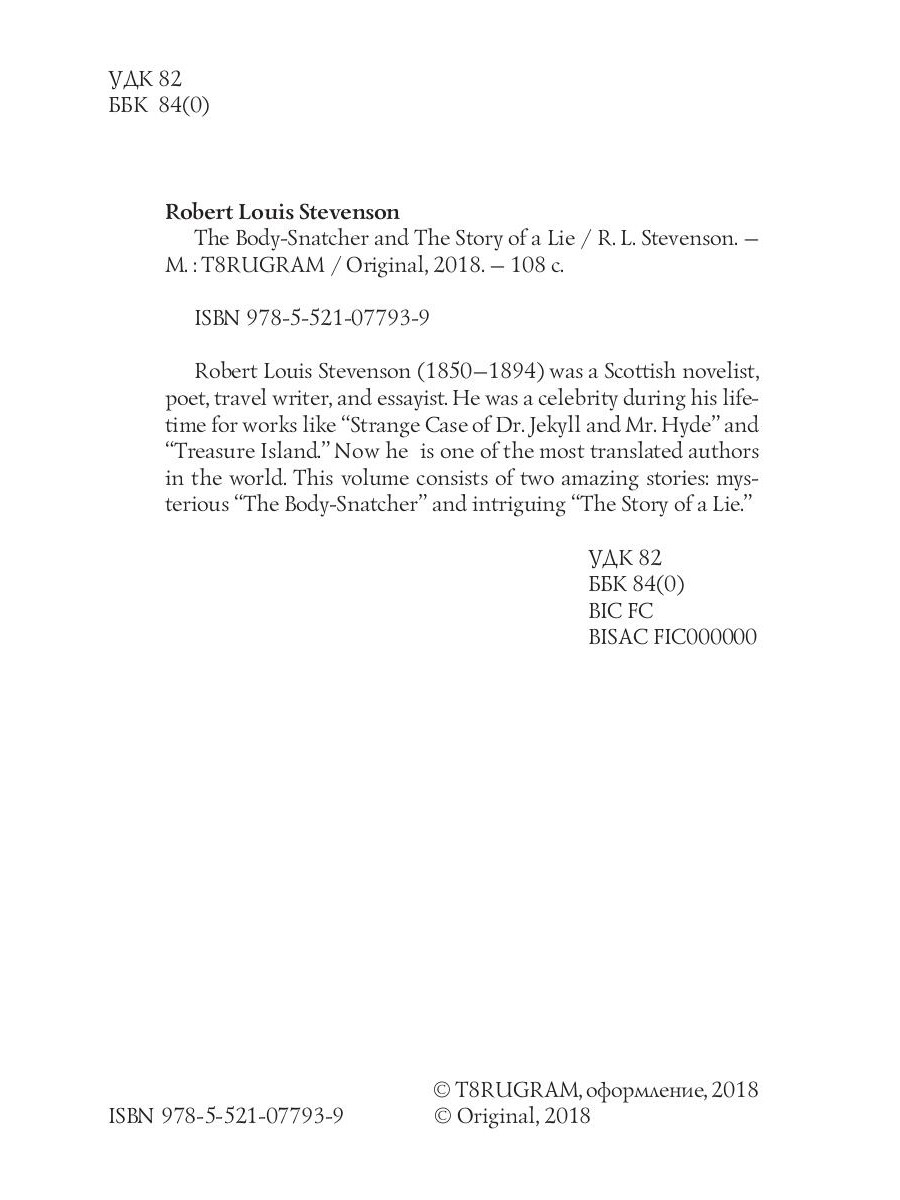 Robert Louis Stevenson (1850-1894) was a Scottish novelist, poet, travel writer, and essayist. He was a celebrity during his lifetime for works like "Strange Case of Dr. Jekyll and Mr. Hyde" and "Treasure Island." Now he is one of the most translated authors in the world. This volume consists of two amazing stories: mysterious "The Body-Snatcher" and intriguing "The Story of a Lie."| Издательство | Т8 RUGRAM |