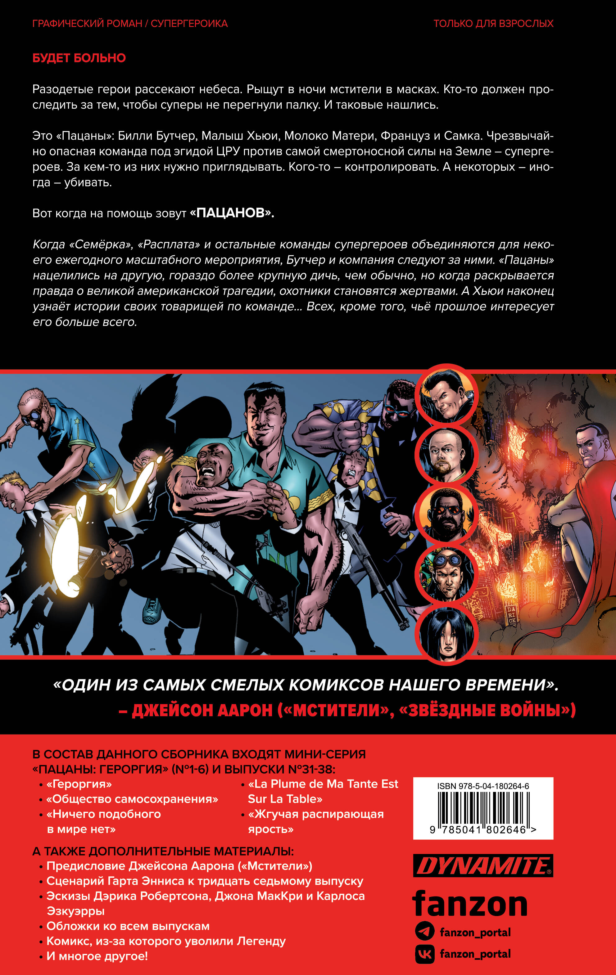 Когда «Семёрка», «Расплата» и остальные команды супергероев объединяются для некоего ежегодного масштабного мероприятия, Бутчер и компания следуют за ними. «Пацаны» нацелились на другую, гораздо более крупную дичь, чем обычно, но когда раскрывается правда о великой американской трагедии, охотники становятся жертвами. А Хьюи наконец узнаёт истории своих товарищей по команде… Всех, кроме того, чьё прошлое интересует его больше всего. Впервые в России - мини-серия «Героргия», выпуски № 31-38 гротескного супергеройского комикса Гарта Энниса и Дэрика Робертсона и дополнительные материалы под одной твёрдой обложкой. Успешная провокационная серия THE BOYS увлечёт вас в мир сатиры на супергероев - безбашенный и непредсказуемый! Основа суперуспешного сериала на Amazon Prime, который высоко оценили зрители и продлили на пятый сезон. Фантастика, криминал, пародия, боевик, драма и море чёрного юмора.| Издательство | ООО "Издательство "Эксмо" |