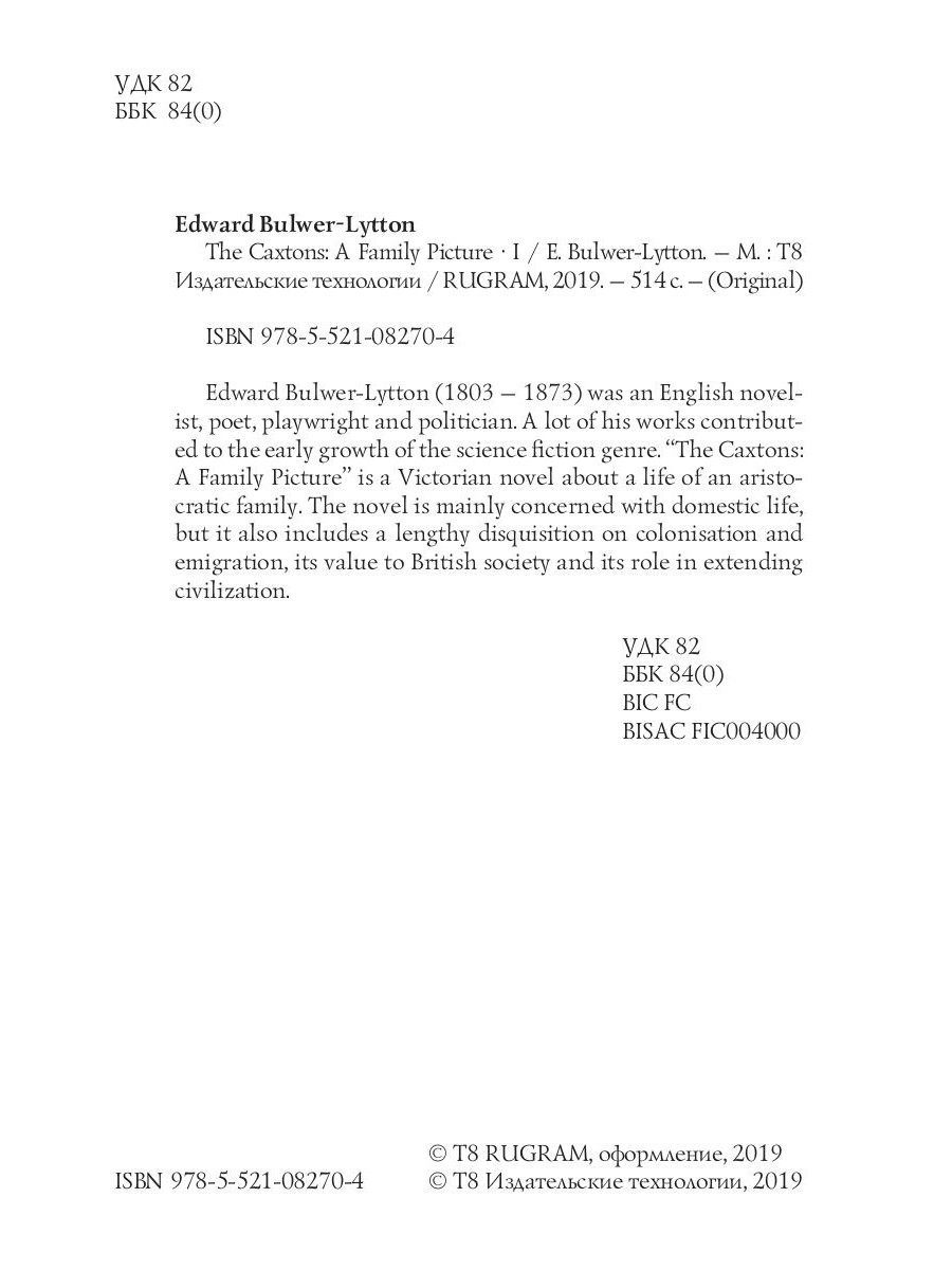 Edward Bulwer-Lytton (1803 - 1873) was an English novelist, poet, playwright and politician. A lot of his works contributed to the early growth of the science fiction genre. "The Caxtons: A Family Picture" is a Victorian novel about a life of an aristocratic family. The novel is mainly concerned with domestic life, but it also includes a lengthy disquisition on colonisation and emigration, its value to British society and its role in extending civilization.| Издательство | Т8 RUGRAM |