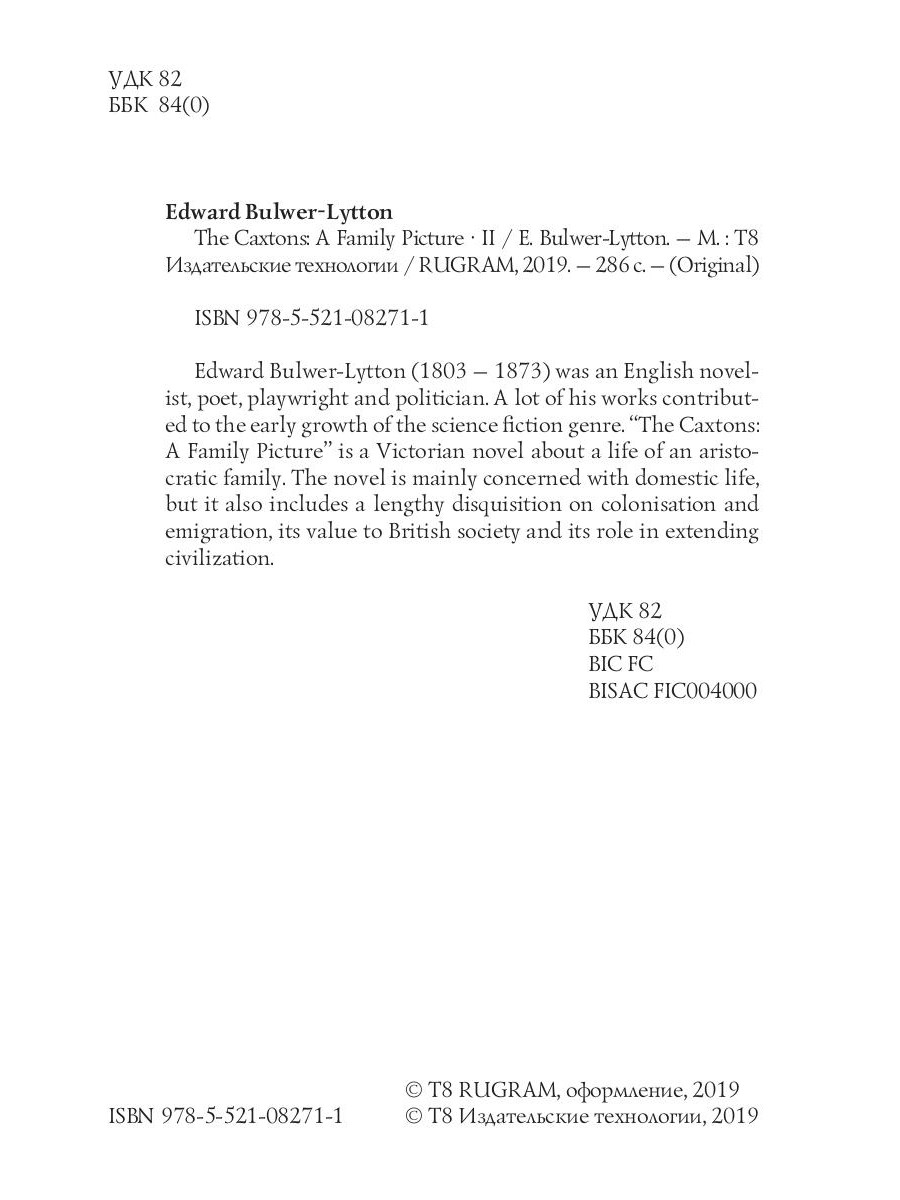 Edward Bulwer-Lytton (1803 - 1873) was an English novelist, poet, playwright and politician. A lot of his works contributed to the early growth of the science fiction genre. "The Caxtons: A Family Picture" is a Victorian novel about a life of an aristocratic family. The novel is mainly concerned with domestic life, but it also includes a lengthy disquisition on colonisation and emigration, its value to British society and its role in extending civilization.| Издательство | Т8 RUGRAM |