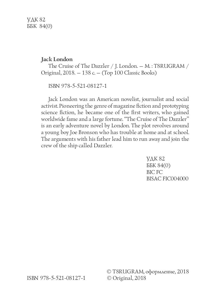 Jack London was an American novelist, journalist and social activist. Pioneering the genre of magazine fiction and prototyping science fiction, he became one of the first writers, who gained worldwide fame and a large fortune. "The Cruise of The Dazzler" is an early adventure novel by London. The plot revolves around a young boy Joe Bronson who has trouble at home and at school. The arguments with his father lead him to run away and join the crew of the ship called Dazzler.| Издательство | Т8 RUGRAM |