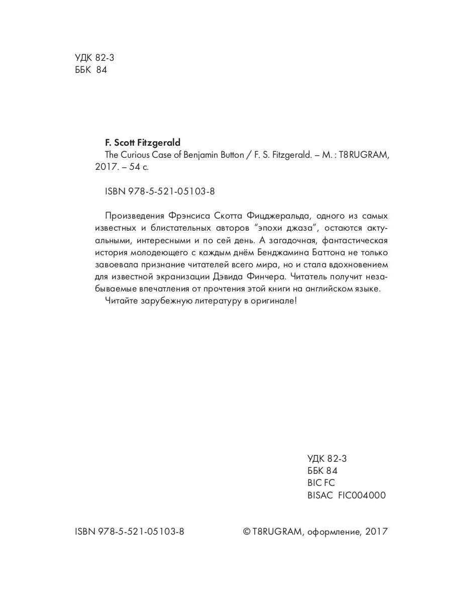 Произведения Фрэнсиса Скотта Фицджеральда, одного из самых известных и блистательных авторов "эпохи джаза", остаются актуальными, интересными и по сей день. А загадочная, фантастическая история молодеющего с каждым днём Бенджамина Баттона не только завоевала признание читателей всего мира, но и стала вдохновением для известной экранизации Дэвида Финчера. Читатель получит незабываемые впечатления от прочтения этой книги на английском языке. Читайте зарубежную литературу в оригинале!