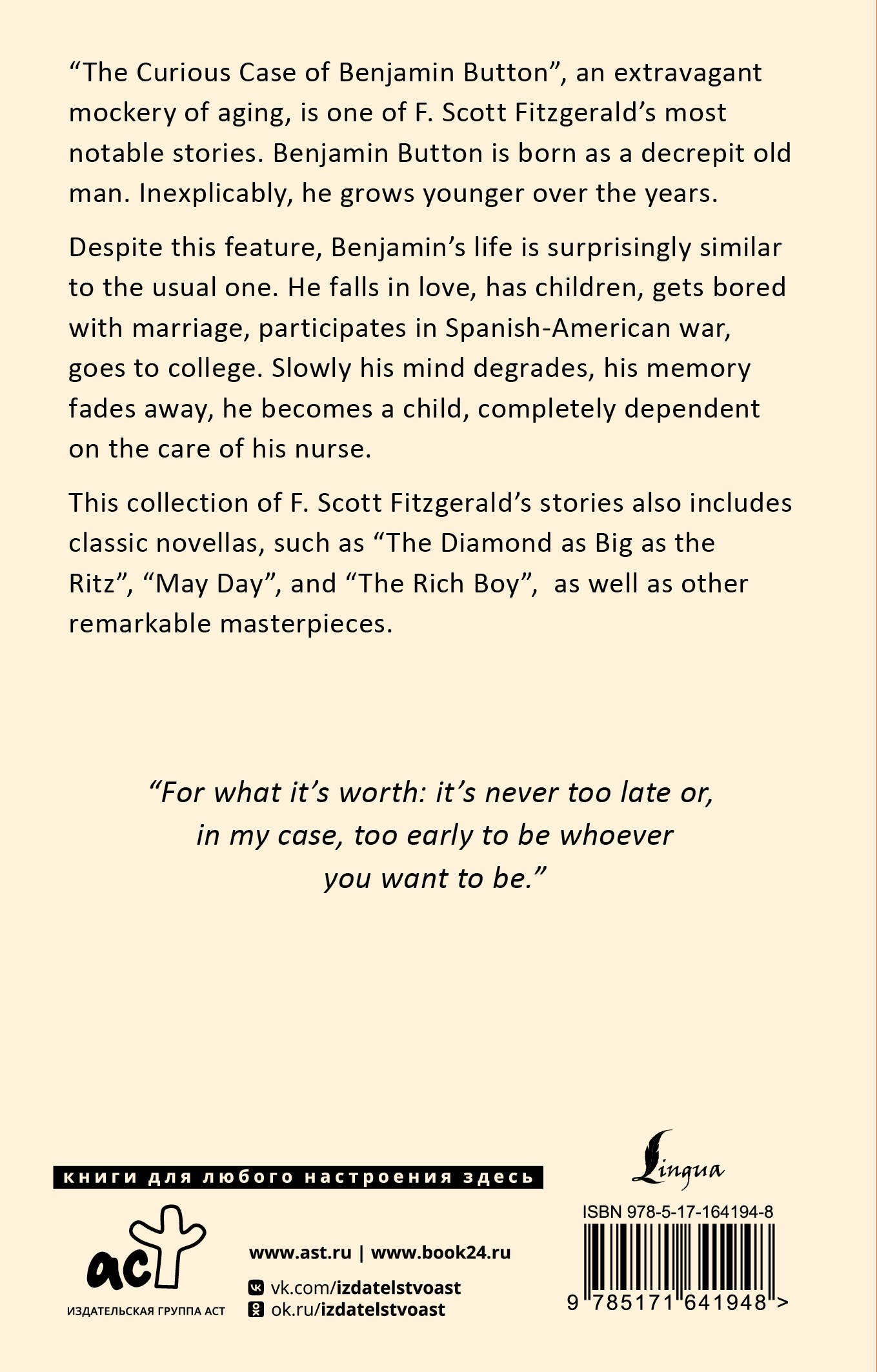 Не можете найти время, чтобы попрактиковать английский? Поучитесь тайм-мендеждменту у Бенджамина Баттона, с этим прекрасным карманным изданием! "Загадочная история Бенджамина Баттона", экстравагантная насмешка над старением, является одним из самых известных рассказов Ф. Скотта Фицджеральда. Бенджамин Баттон родился дряхлым стариком. Необъяснимо, но с годами он молодеет.Несмотря на эту особенность, жизнь Бенджамина удивительно похожа на обычную. Он влюбляется, заводит детей, ему наскучивает брак, участвует в испано-американской войне, учится в колледже. Постепенно его разум деградирует, память угасает, он становится ребенком, полностью зависимым от заботы няни. В этот сборник рассказов Ф. Скотта Фицджеральда вошли также классические новеллы, такие как "Бриллиант размером с Ритц", "Первомайский день", "Богатый мальчик", а также другие замечательные шедевры. Издание без адаптации. Наслаждайтесь талантом Ф. С. Фицджеральда в оригинале!