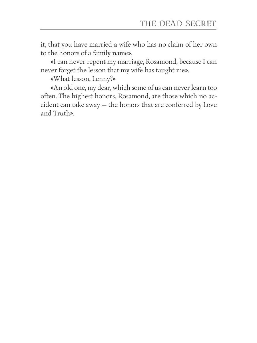 The Dead Secret was Collins's first full-length puzzle-romance. Moments from death, Mrs Treverton tells a secret, never to be passed to her husband. Years later, when her daughter Rosamond returns with her husband, she is warned not to enter the Myrtle Room. Strong-minded and ingenious, Rosamond's determined detective work uncovers a shocking truth.