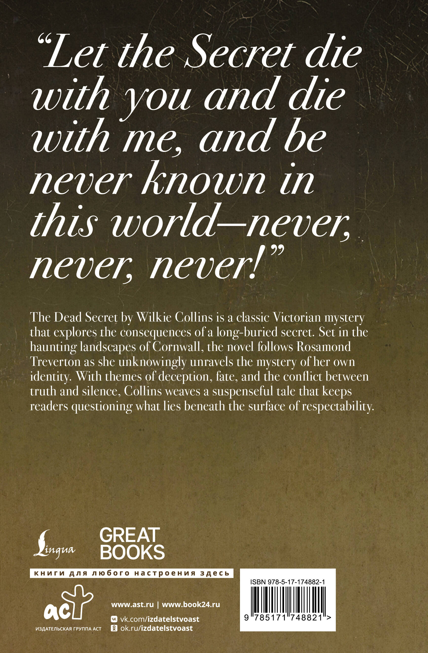 Смертельная тайна, унесённая в могилу, продолжает влиять на жизни живых. Розамонд Франкленд сталкивается с загадочным прошлым, которое упорно не хочет оставаться забытым. Героиня должна разобраться в запутанном клубке семейных тайн, подмен и скрытых писем и раскрыть правду - даже если она грозит разрушить всё, что ей дорого. "Мертвая комната" - захватывающий готический роман, в котором Уилки Коллинз мастерски сочетает интригу, драму и психологическую глубину. Роман публикуется на английском языке без адаптации и сокращений.| Издательство | Издательство "АСТ" |