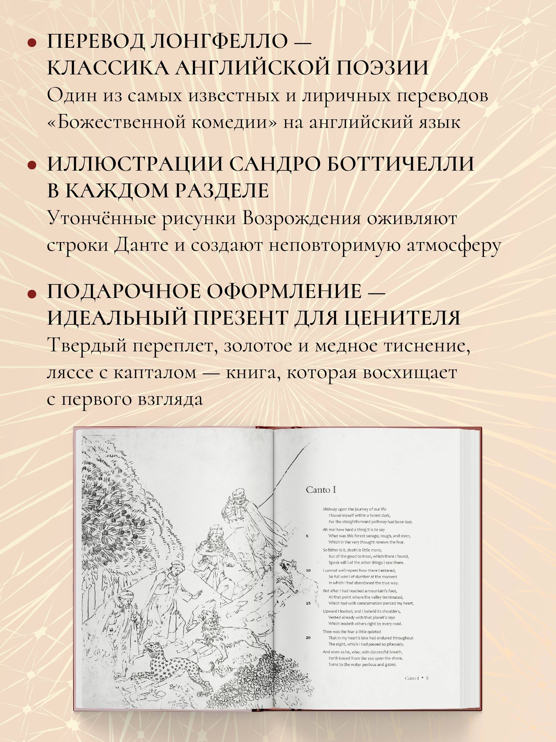 "Божественная комедия" Данте Алигьери - одно из самых значимых произведений мировой литературы, которое на протяжении веков служило источником вдохновения для многих деятелей искусства. Это аллегорическое путешествие души сквозь Ад, Чистилище и Рай - глубоко личное, философское и поэтичное размышление о человеческой природе, нравственности и стремлении к свету. Впервые опубликованное в XIV веке, в настоящем издании произведение представлено в классическом переводе на английский язык Генри Уодсворта Лонгфелло - одного из крупнейших поэтов своего времени. Его перевод отличается точностью и лиричностью, оставаясь одним из самых читаемых в англоязычном мире. Оформление подарочного издания достойно великого произведения: твердый переплет с тактильным тканевым корешком, изящные элементы из золотой и медной фольги создают торжественное настроение, а золотая лента-ляссе с капталом в тон служат изящными акцентами для настоящих ценителей. Книга дополнена иллюстрациями Сандро Боттичелли, великого мастера эпохи Возрождения, чьи утончённые образы оживают на страницах поэмы. Коллекционное издание станет достойным подарком - и приглашением заново прикоснуться к бессмертному произведению.| Издательство | Издательство "АСТ" |