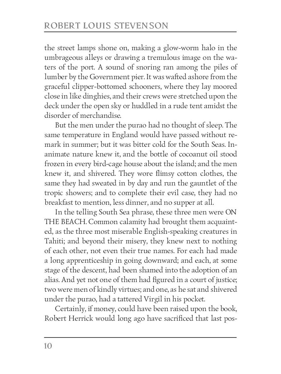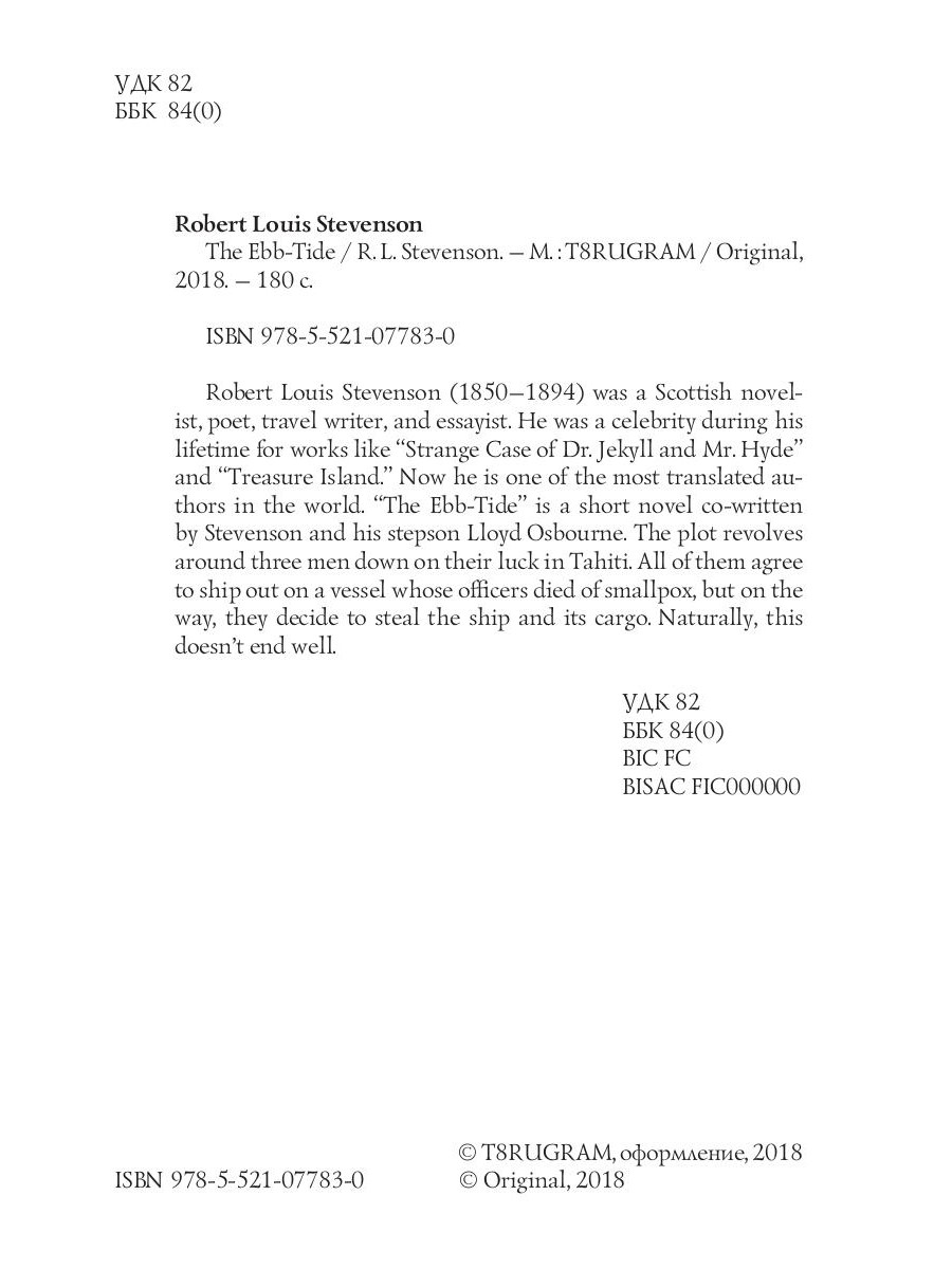 Robert Louis Stevenson (1850-1894) was a Scottish novelist, poet, travel writer, and essayist. He was a celebrity during his lifetime for works like "Strange Case of Dr. Jekyll and Mr. Hyde" and "Treasure Island." Now he is one of the most translated authors in the world. "The Ebb-Tide" is a short novel co-written by Stevenson and his stepson Lloyd Osbourne. The plot revolves around three men down on their luck in Tahiti. All of them agree to ship out on a vessel whose officers died of smallpox, but on the way, they decide to steal the ship and its cargo. Naturally, this doesn't end well.| Издательство | Т8 RUGRAM |