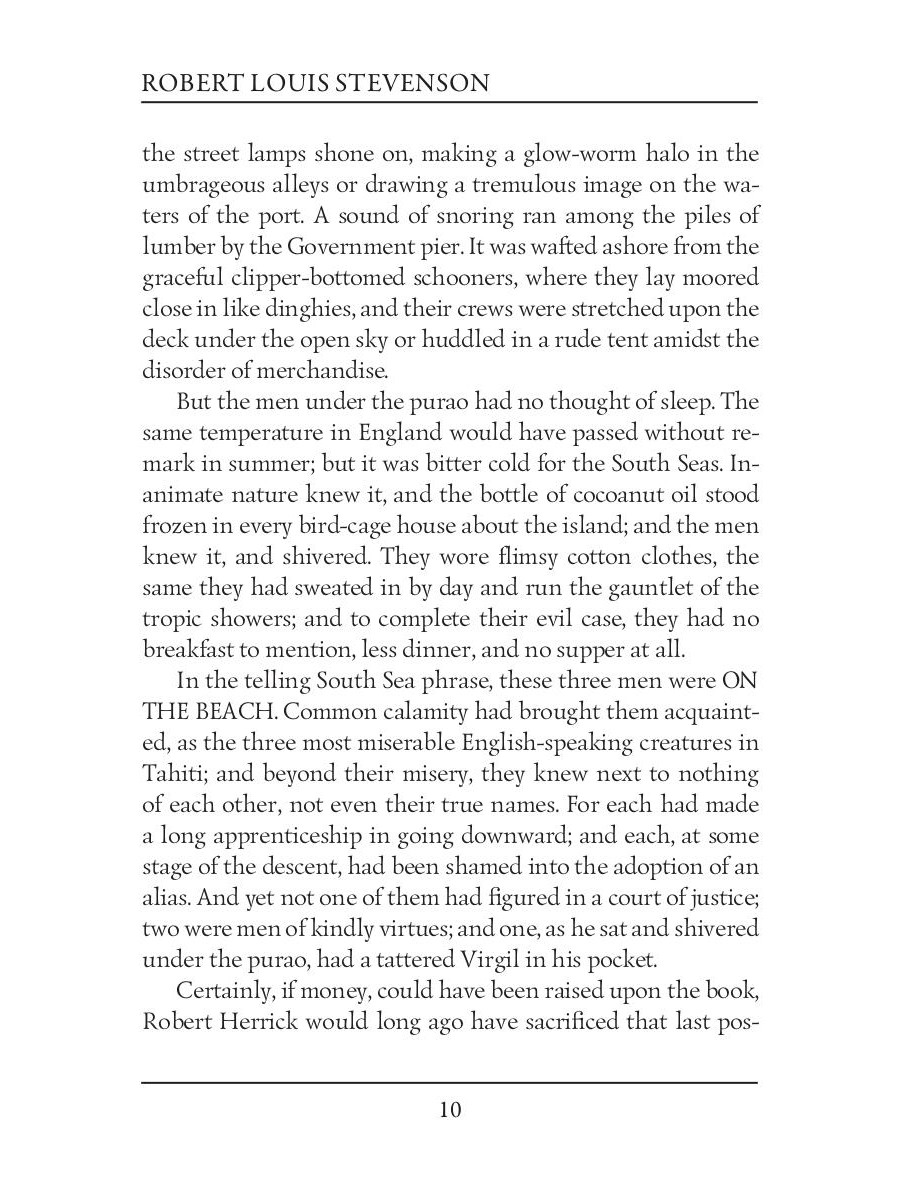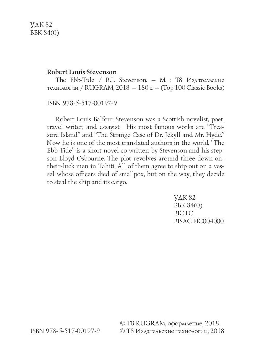 Robert Louis Balfour Stevenson was a Scottish novelist, poet, travel writer, and essayist. His most famous works are "Treasure Island" and "The Strange Case of Dr. Jelcyll and Mr. Hyde." Now he is one of the most translated authors in the world. "The Ebb-Tide" is a short novel co-written by Stevenson and his stepson Lloyd Osbourne. The plot revolves around three down-on-their-luck men in Tahiti. All of them agree to ship out on a vessel whose officers died of smallpox, but on the way, they decide to steal the ship and its cargo.| Издательство | Т8 RUGRAM |