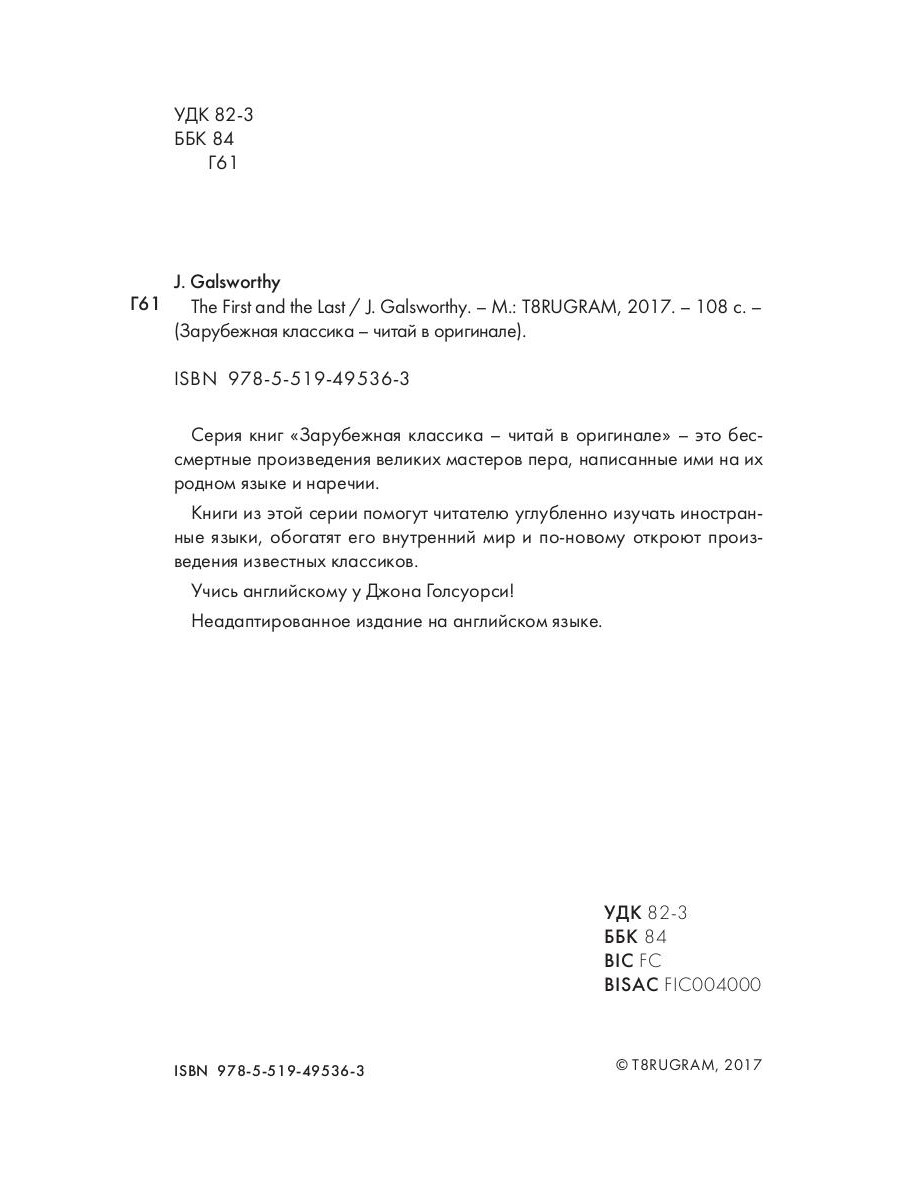 «Зарубежная классика - читай в оригинале» - коллекция, которая собрана из бессмертных произведений великих мастеров пера, написанных ими на их родном языке. Книги из этой серии помогут читателю углублённо изучать иностранные языки, обогатят его внутренний мир и по-новому откроют произведения известных классиков. Учись английскому у Джона Голсуорси!| Издательство | Т8 (Книга по Требованию) |