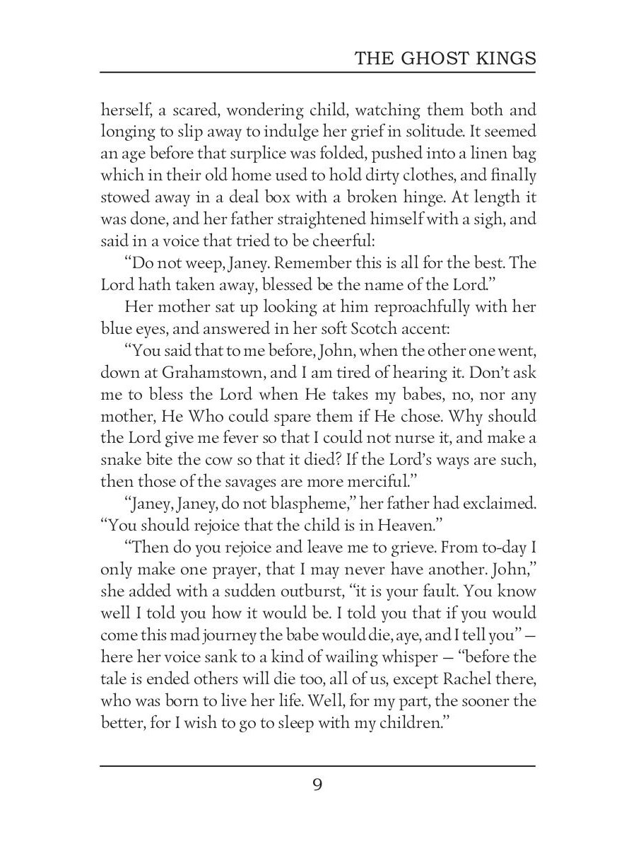Sir Henry Rider Haggard was an English writer of adventure novels set mostly in Africa, and a founder of the Lost World literary genre. In The Ghost Kings Rachel Dove and Richard Darrien meet in Africa, when the brave man saves Rachel, a minister's daughter, from a flash flood. Years pass before they meet again: This time Rachel needs help escaping a Zulu tribe that would have her as their goddess and evading another man who wants her for his own.