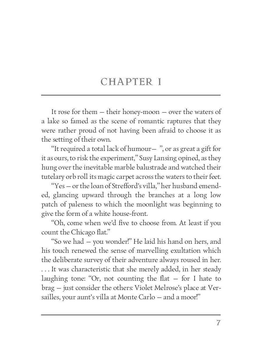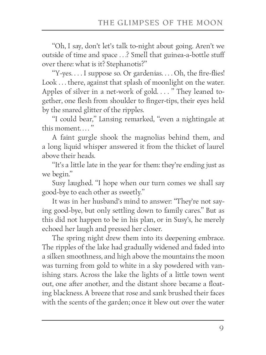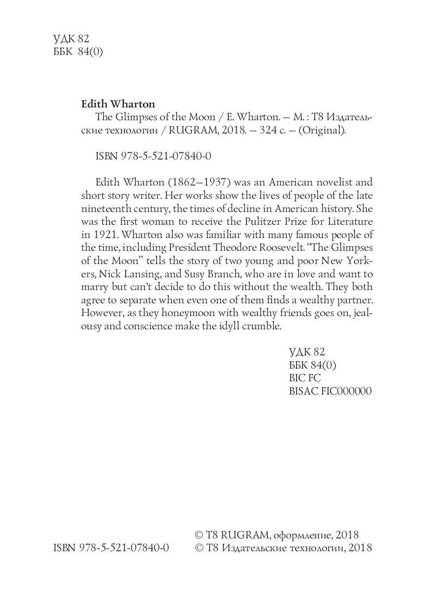 Edith Wharton (1862-1937) was an American novelist and short story writer. Her works show the lives of people of the late nineteenth century, the times of decline in American history. She was the first woman to receive the Pulitzer Prize for Literature in 1921. Wharton also was familiar with many famous people of the time, including President Theodore Roosevelt. "The Glimpses of the Moon" tells the story of two young and poor New Yorkers, Nick Lansing, and Susy Branch, who are in love and want to marry but can't decide to do this without the wealth. They both agree to separate when even one of them finds a wealthy partner. However, as they honeymoon with wealthy friends goes on, jealousy and conscience make the idyll crumble.