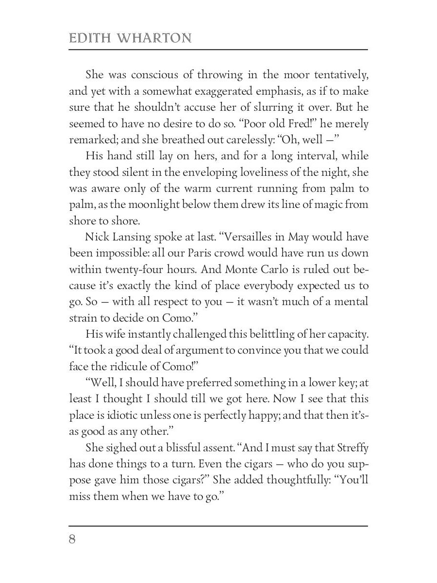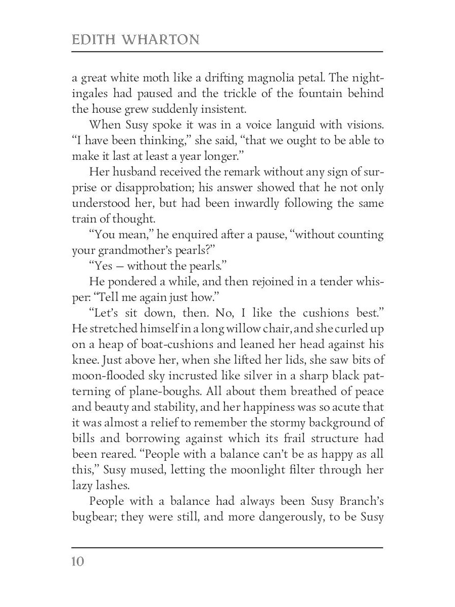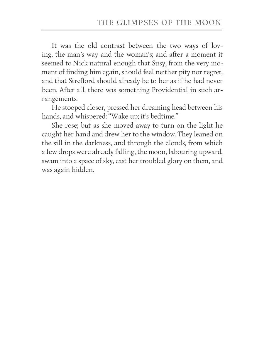 Edith Wharton (1862-1937) was an American novelist and short story writer. Her works show the lives of people of the late nineteenth century, the times of decline in American history. She was the first woman to receive the Pulitzer Prize for Literature in 1921. Wharton also was familiar with many famous people of the time, including President Theodore Roosevelt. "The Glimpses of the Moon" tells the story of two young and poor New Yorkers, Nick Lansing, and Susy Branch, who are in love and want to marry but can't decide to do this without the wealth. They both agree to separate when even one of them finds a wealthy partner. However, as they honeymoon with wealthy friends goes on, jealousy and conscience make the idyll crumble.