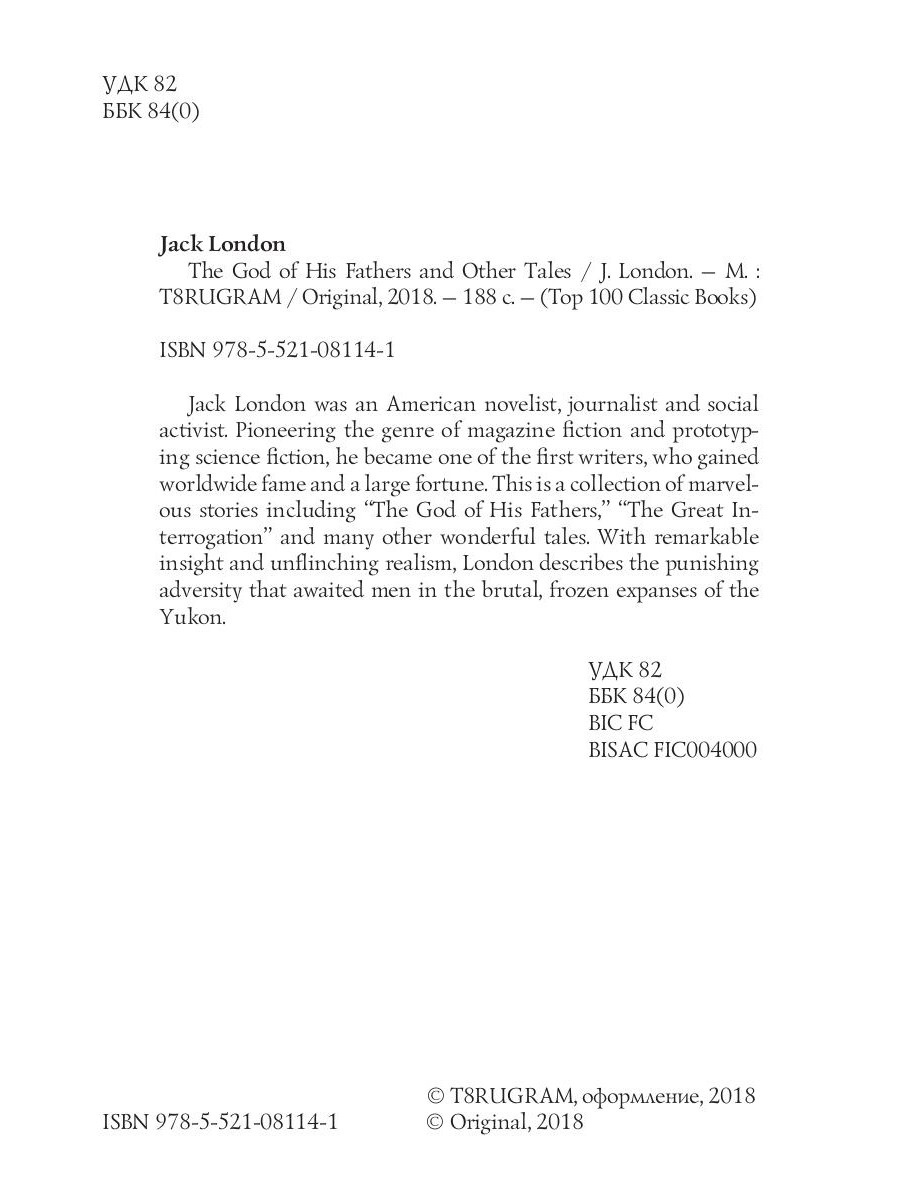 Jack London was an American novelist, journalist and social activist. Pioneering the genre of magazine fiction and prototyping science fiction, he became one of the first writers, who gained worldwide fame and a large fortune. This is a collection of marvelous stories including "The God of His Fathers," "The Great Interrogation" and many other wonderful tales. With remarkable insight and unflinching realism, London describes the punishing adversity that awaited men in the brutal, frozen expanses of the Yukon.| Издательство | Т8 RUGRAM |