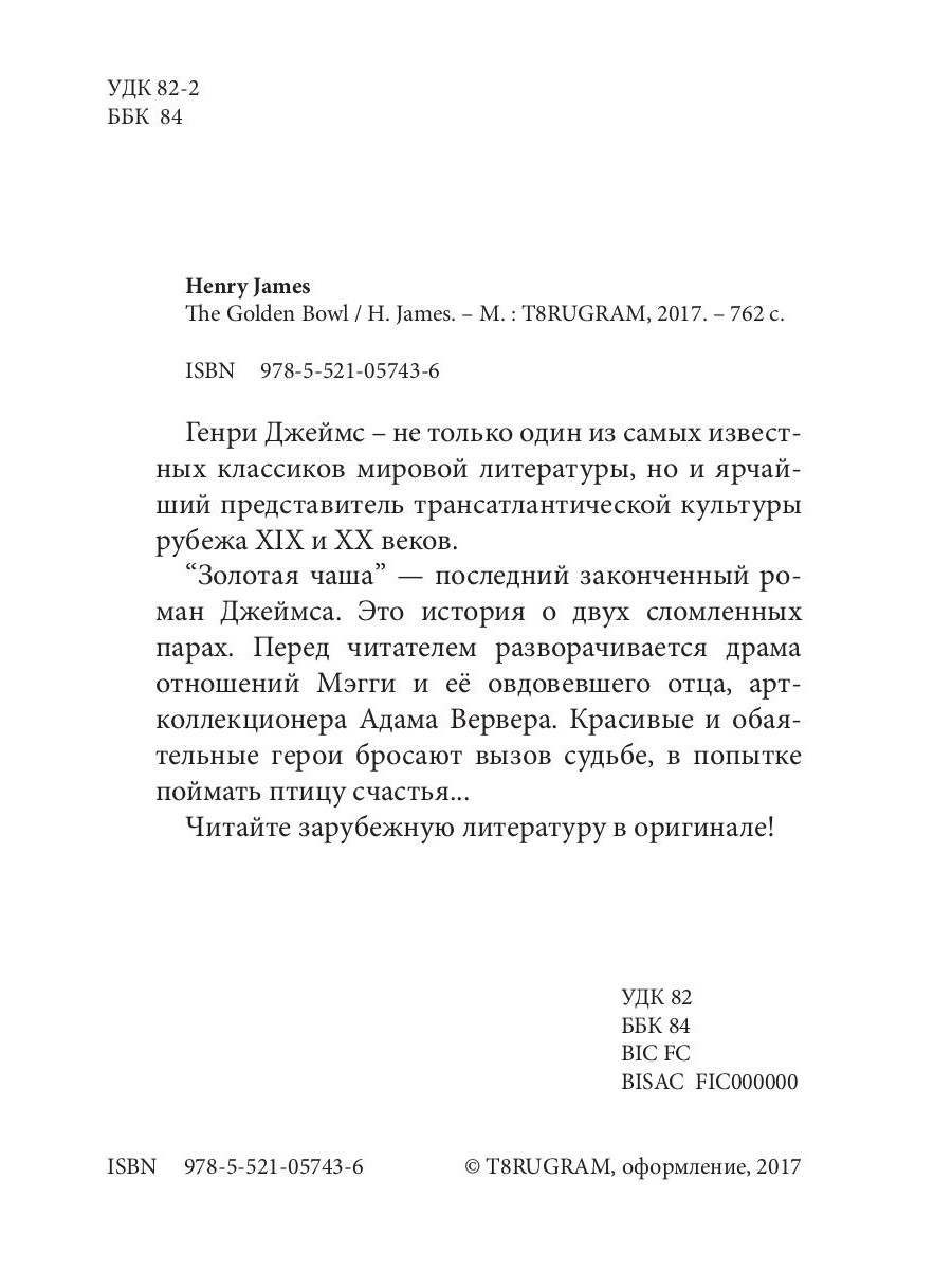 "Золотая чаша" - последний законченный роман Джеймса. Это история о двух сломленных парах. Перед читателем разворачивается драма отношений Мэгги и её овдовевшего отца, артколлекционера Адама Вервера. Красивые и обаятельные герои бросают вызов судьбе, в попытке поймать птицу счастья...