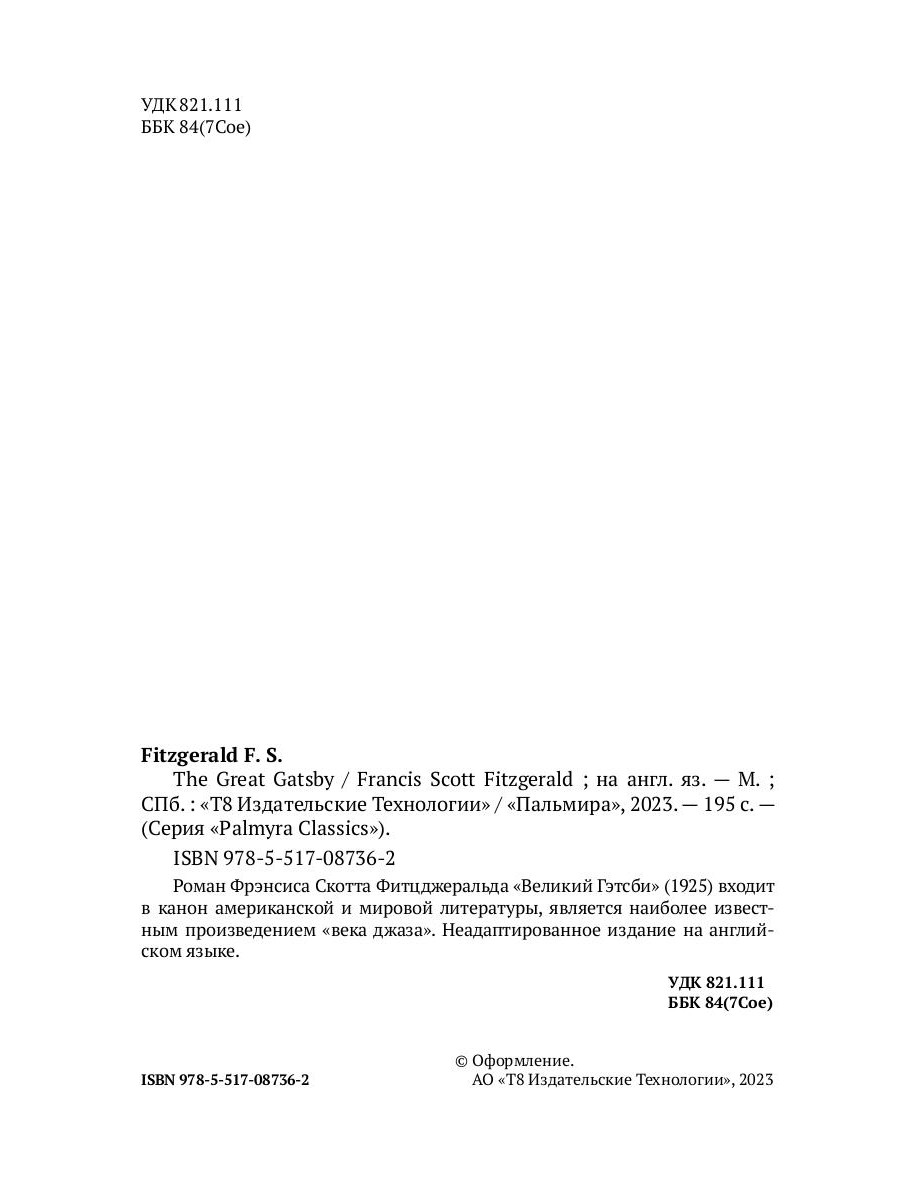 Роман Фрэнсиса Скотта Фитцджеральда "Великий Гэтсби" (1925) входит в канон американской и мировой литературы, является наиболее известным произведением "века джаза". Неадаптированное издание на английском языке.