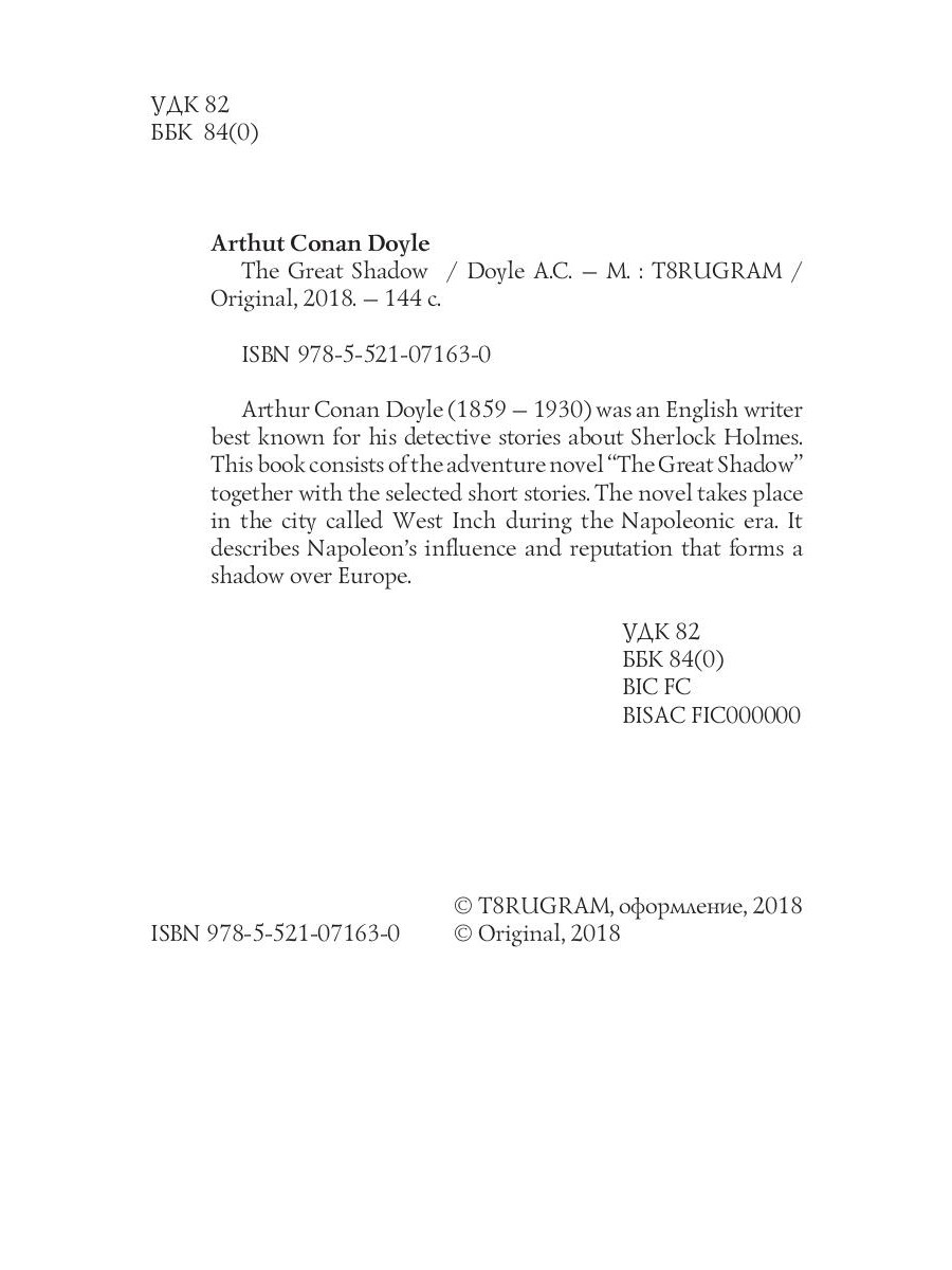 Arthur Conan Doyle (1859 - 1930) was an English writer best known for his detective stories about Sherlock Holmes. This book consists of the adventure novel "The Great Shadow" together with the selected short stories. The novel takes place in the city called West Inch during the Napoleonic era. It describes Napoleon's influence and reputation that forms a shadow over Europe.| Издательство | Т8 RUGRAM |