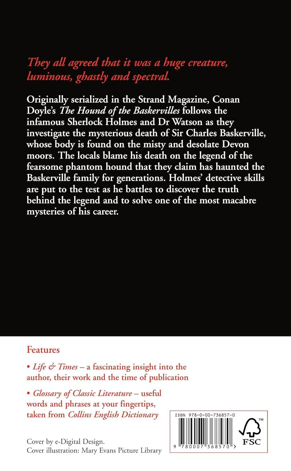 The hound of the Baskervilles (A. Conan Doyle) Originally serialised in The Strand Magazine, Conan Doyle's The Hound of the Baskervilles follows the infamous Sherlock Holmes and Dr Watson as they investigate the mysterious death of Sir Charles Baskerville, whose dead body is found on the misty and desolate Devon moors. Собака Баскервиллей (Конан Дойл) Роман Конан Дойла "Собака Баскервилей", впервые опубликованный в журнале "Стрэнд", рассказывает об известном сыщике Шерлоке Холмсе и докторе Ватсоне, расследующих загадочную смерть сэра Чарльза Баскервиля, чье мертвое тело было найдено на туманных и пустынных девонских пустошах.| Издательство | Harper Collins Publishers Ltd |