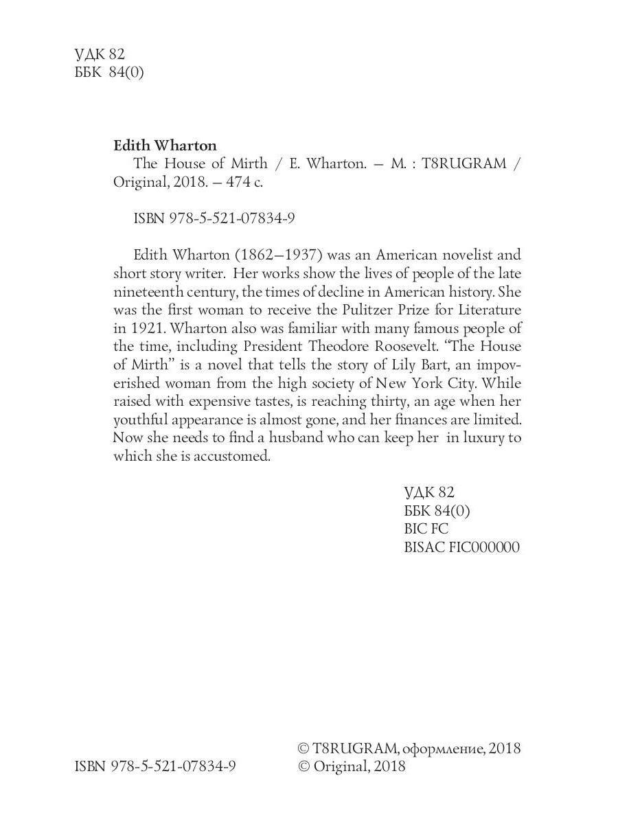 Edith Wharton (1862-1937) was an American novelist and short story writer. Her works show the lives of people of the late nineteenth century, the times of decline in American history. She was the first woman to receive the Pulitzer Prize for Literature in 1921. Wharton also was familiar with many famous people of the time, including President Theodore Roosevelt. "The House of Mirth" is a novel that tells the story of Lily Bart, an impoverished woman from the high society of New York City. While raised with expensive tastes, is reaching thirty, an age when her youthful appearance is almost gone, and her finances are limited. Now she needs to find a husband who can keep her in luxury to which she is accustomed.| Издательство | Т8 RUGRAM |