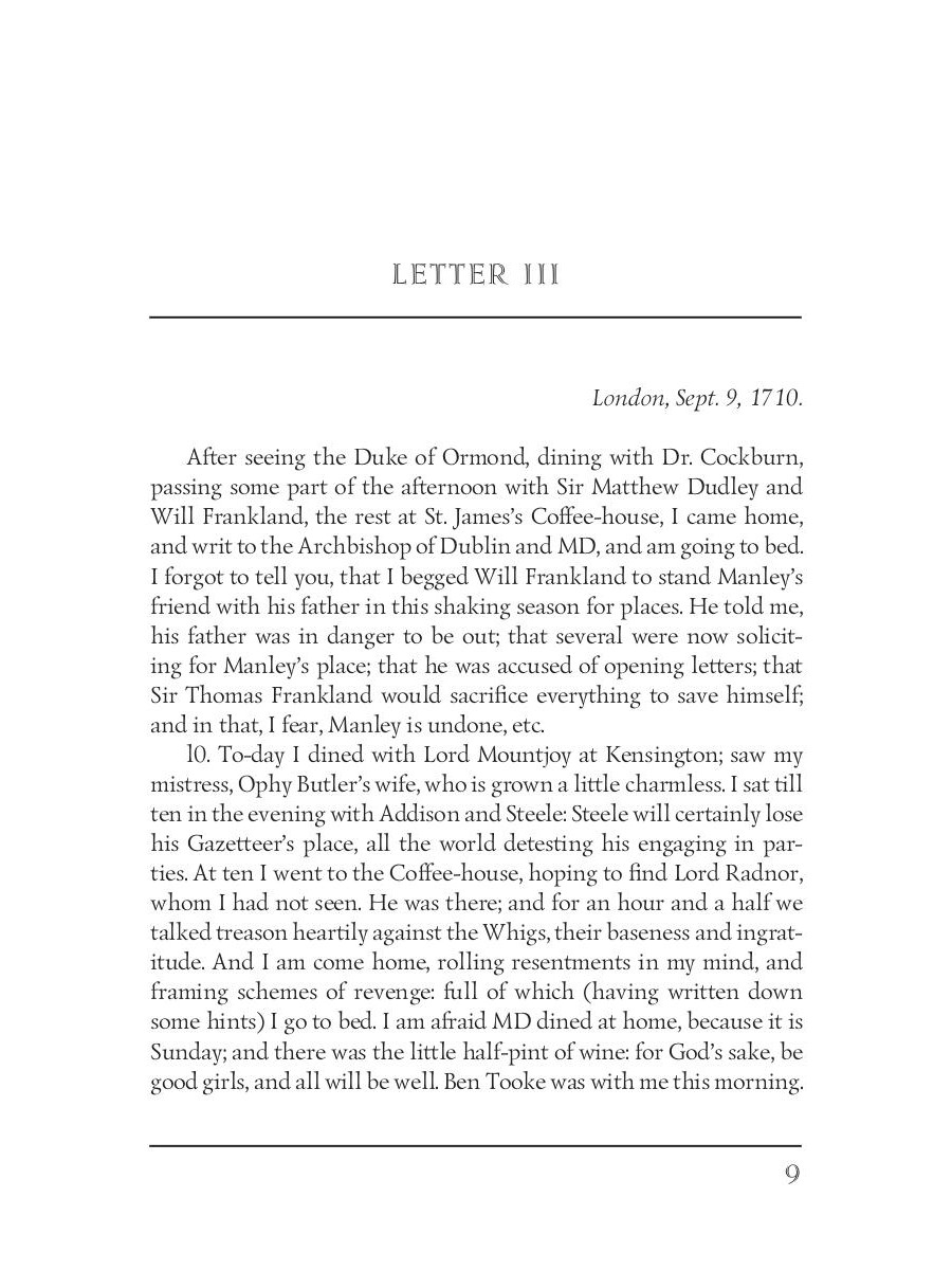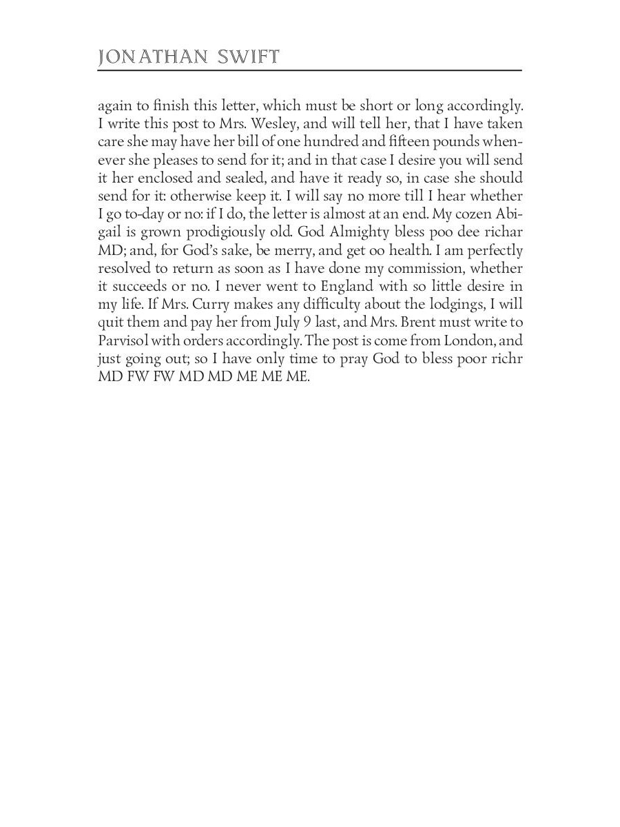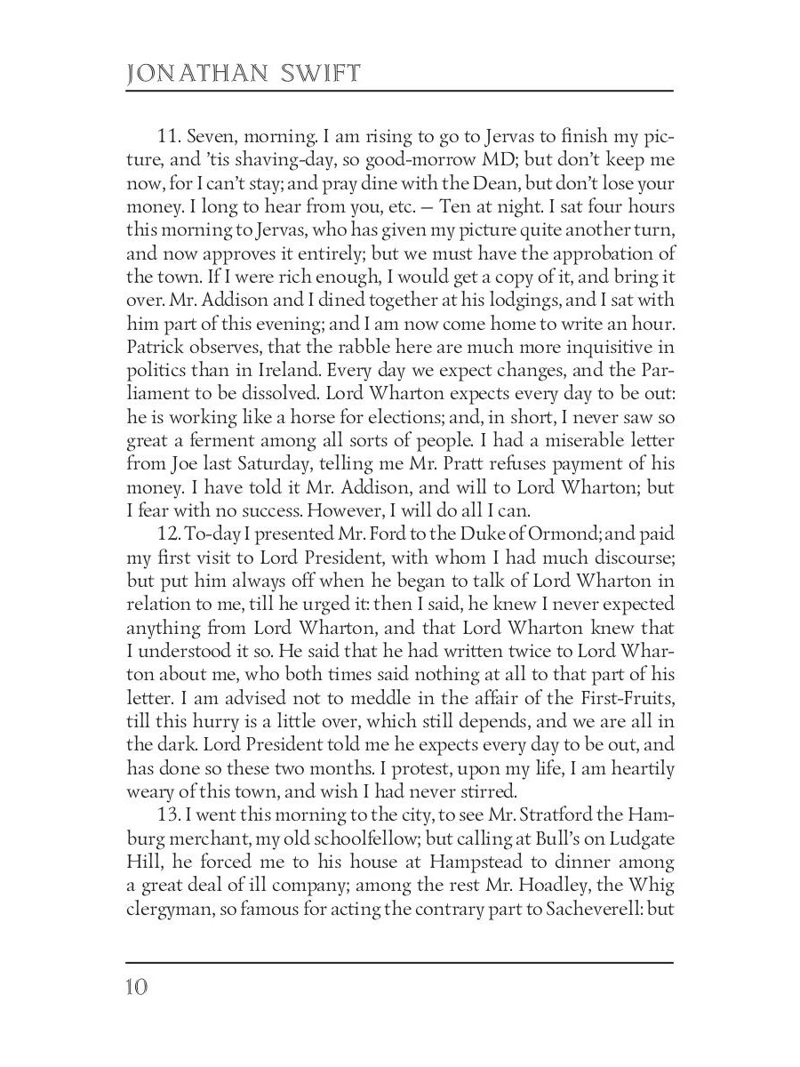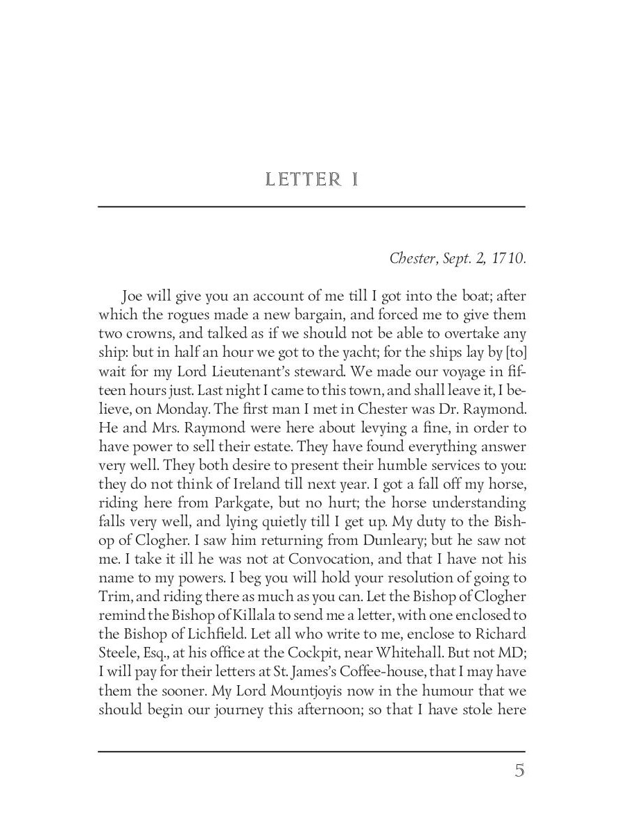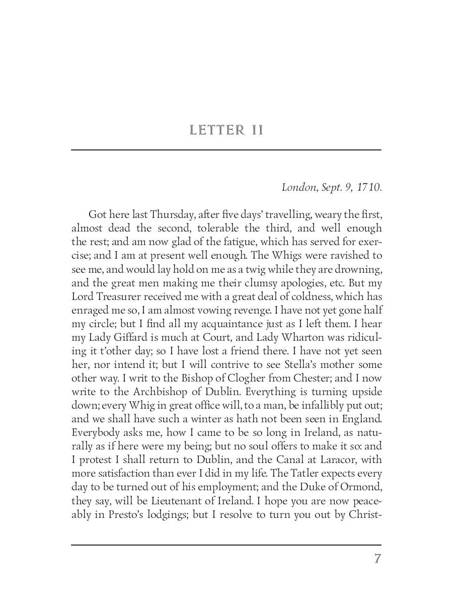 Jonathan Swift (1667-1745) was an Irish satirist, essayist, prose writer and poet, who has found his calling as a cleric of St Patrick's Cathedral in Dublin. "The Journal to Stella" is a collection of sixty-five letters from Jonathan Swift to his friend Esther Johnson, whom he called "Stella" and, according to some reports, was his secret wife, although there is no documentary evidence of it. Swift wrote the letters between 1710 and 1713 in England and many critics consider them as deeply personal.
