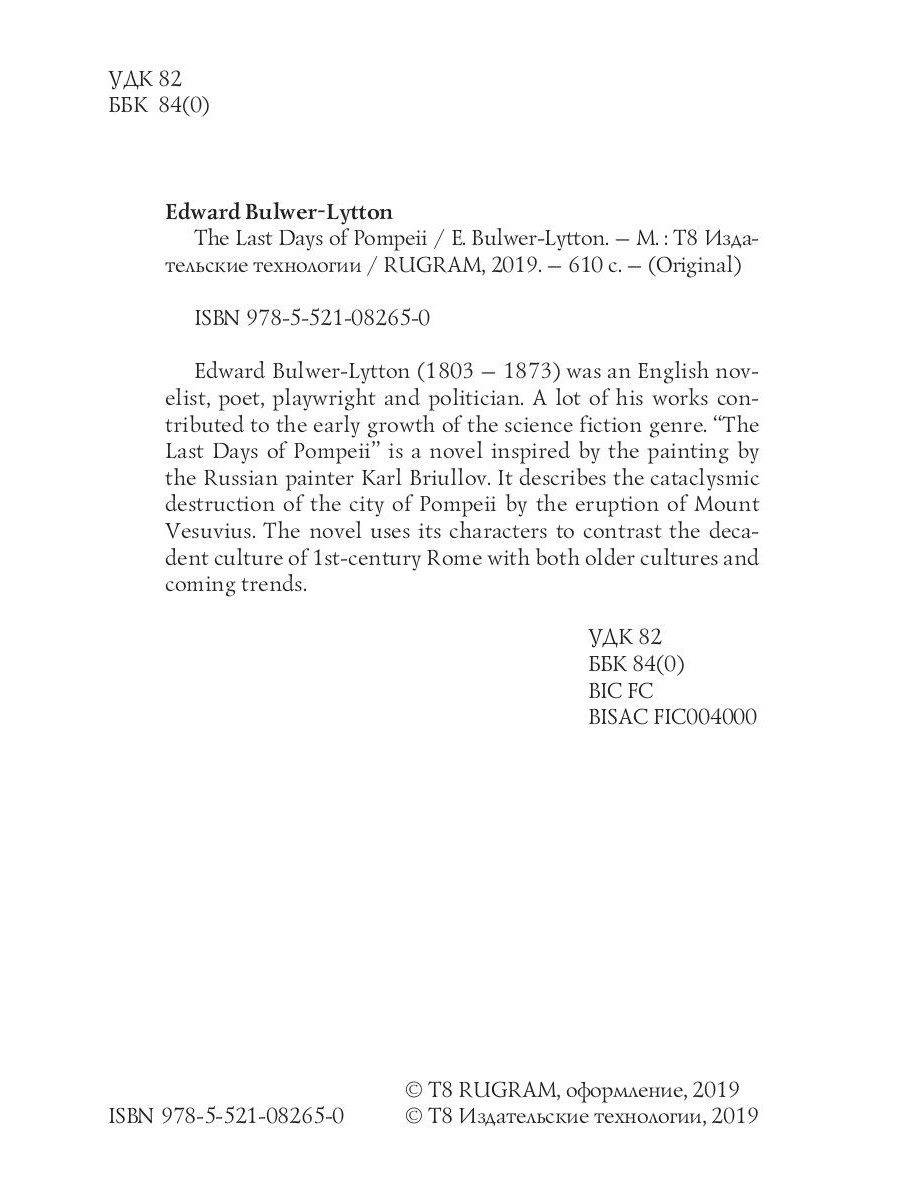 Edward Bulwer-Lytton (1803 - 1873) was an English novelist, poet, playwright and politician. A lot of his works contributed to the early growth of the science fiction genre. "The Last Days of Pompeii" is a novel inspired by the painting by the Russian painter Karl Briullov. It describes the cataclysmic destruction of the city of Pompeii by the eruption of Mount Vesuvius. The novel uses its characters to contrast the decadent culture of 1 st-century Rome with both older cultures and coming trends.| Издательство | Т8 RUGRAM |