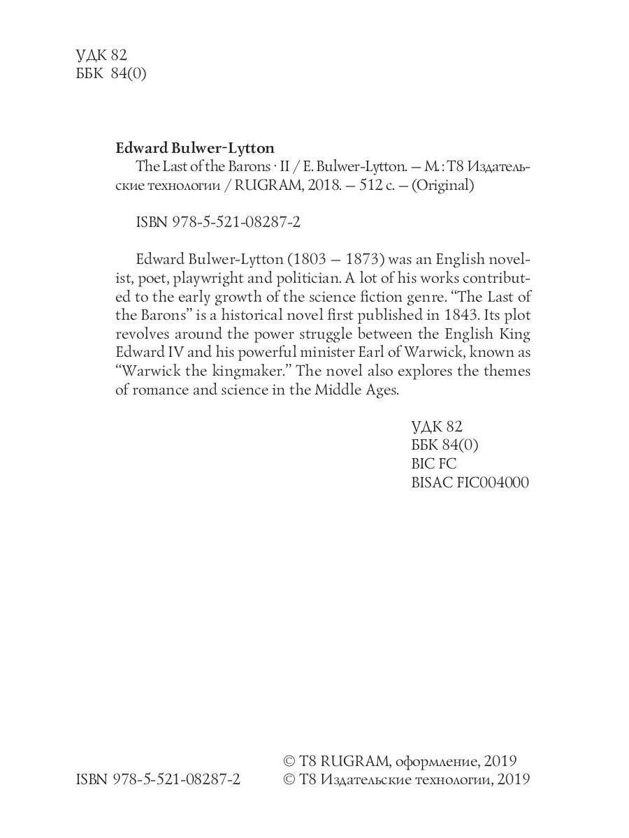 Edward Bulwer-Lytton (1803 - 1873) was an English novelist, poet, playwright and politician. A lot of his works contributed to the early growth of the science fiction genre. "The Last of the Barons" is a historical novel first published in 1843. Its plot revolves around the power struggle between the English King Edward IV and his powerful minister Earl of Warwick, known as "Warwick the kingmaker." The novel also explores the themes of romance and science in the Middle Ages.| Издательство | Т8 RUGRAM |