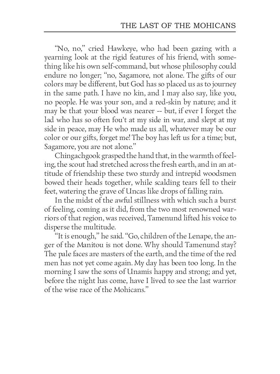James Fenimore Cooper was a prolific and popular American writer of the first half of the 19th century. His historical romances of frontier and Indian life in the early American days created a unique form of American literature. The wild rush of action in this classic frontier adventure story has made The Last of the Mohicans the most popular of James Fenimore Cooper's novels. Deep in the forests of upper New York State, the brave woodsman Hawkeye (Natty Bumppo) and his loyal Mohican friends Chingachgook and Uncas become embroiled in the bloody battles of the French and Indian War.