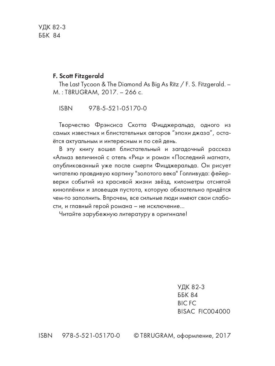 В эту книгу вошел блистательный и загадочный рассказ "Алмаз величиной с отель «Риц»" и роман "Последний магнат", опубликованный уже после смерти Фицджеральда. Он рисует читателю правдивую картину "золотого века" Голливуда: фейерверки событий из красивой жизни звёзд, километры отснятой киноплёнки и зловещая пустота, которую обязательно придётся чем-то заполнить. Впрочем, все сильные люди имеют свои слабости, и главный герой романа - не исключение...