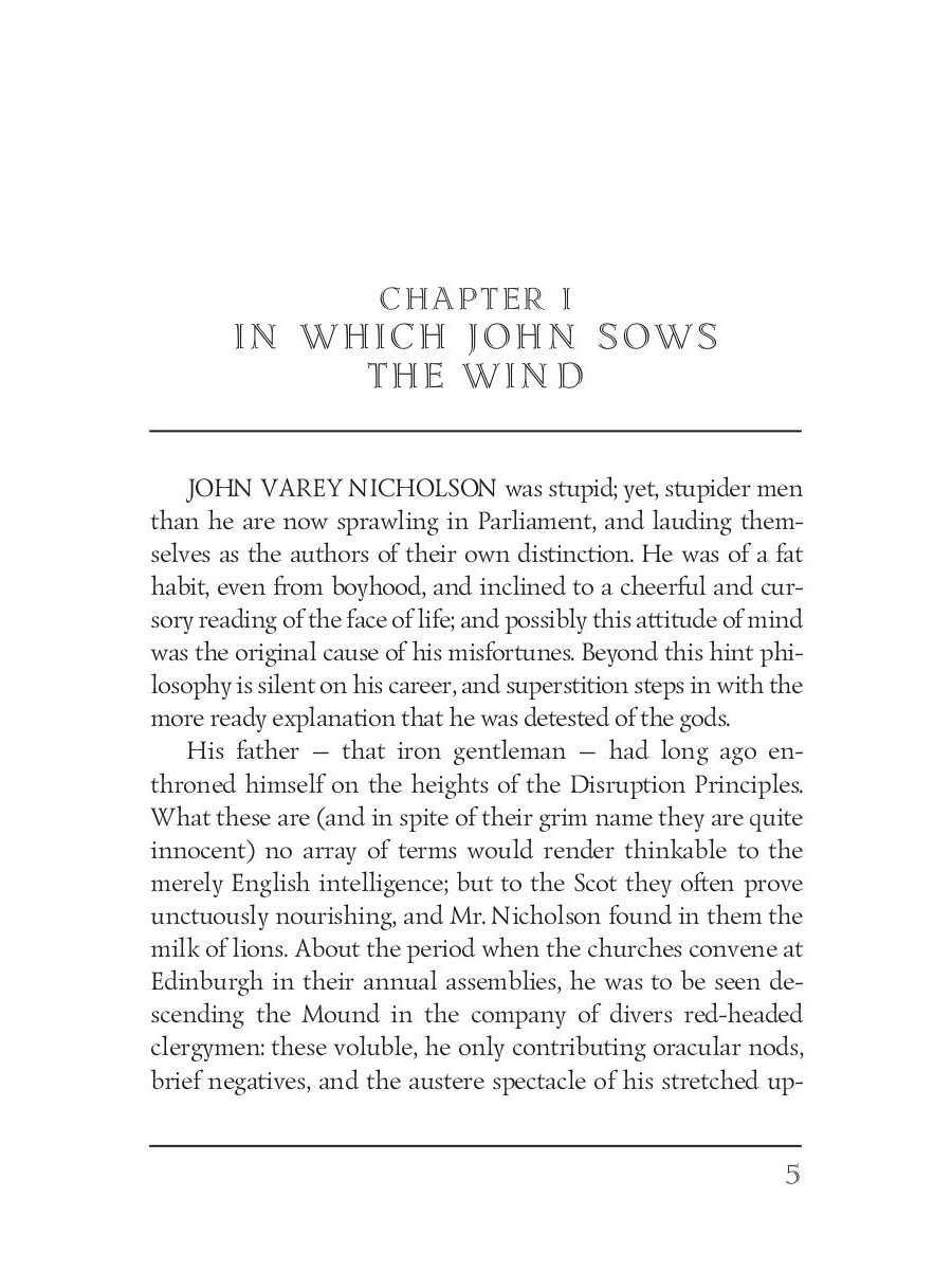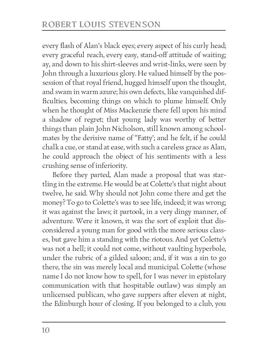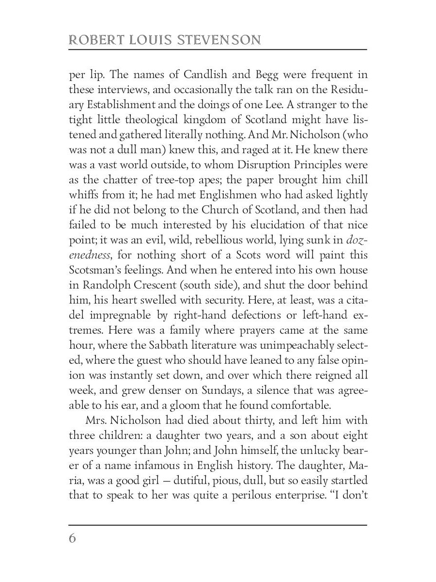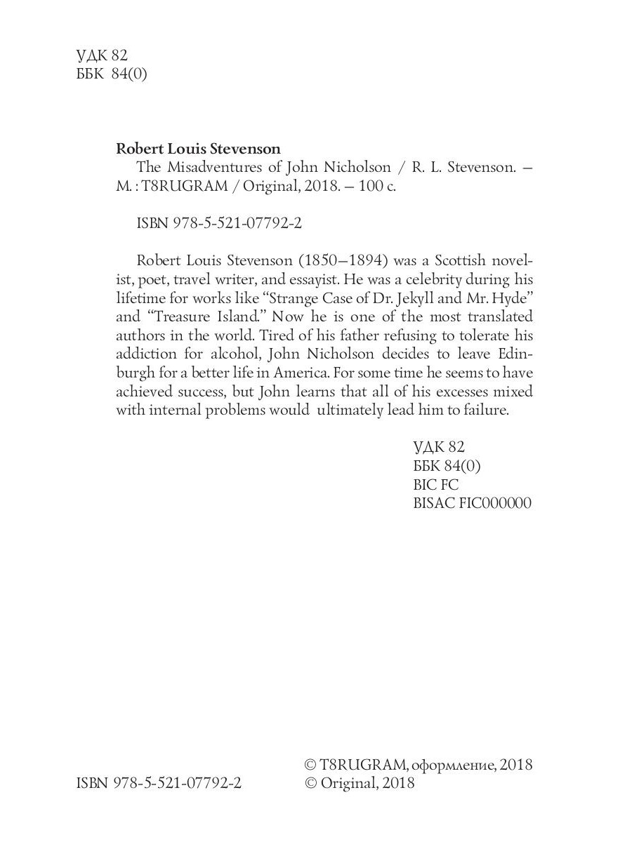 Robert Louis Stevenson (1850-1894) was a Scottish novelist, poet, travel writer, and essayist. He was a celebrity during his lifetime for works like "Strange Case of Dr. Jekyll and Mr. Hyde" and "Treasure Island." Now he is one of the most translated authors in the world. Tired of his father refusing to tolerate his addiction for alcohol, John Nicholson decides to leave Edinburgh for a better life in America. For some time he seems to have achieved success, but John learns that all of his excesses mixed with internal problems would ultimately lead him to failure.| Издательство | Т8 RUGRAM |