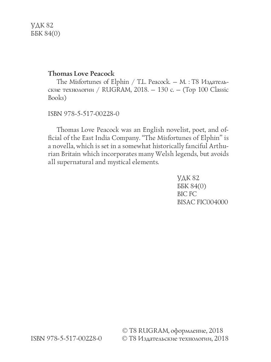 Thomas Love Peacock was an English novelist, poet, and official of the East India Company. "The Misfortunes of Elphin" is a novella, which is set in a somewhat historically fanciful Arthurian Britain which incorporates many Welsh legends, but avoids all supernatural and mystical elements.| Издательство | Т8 RUGRAM |