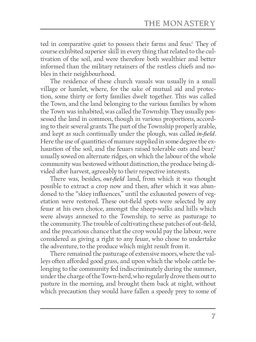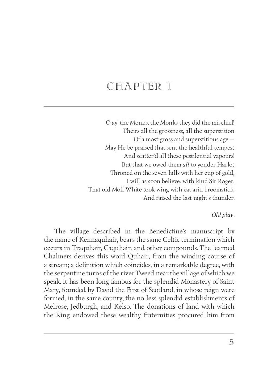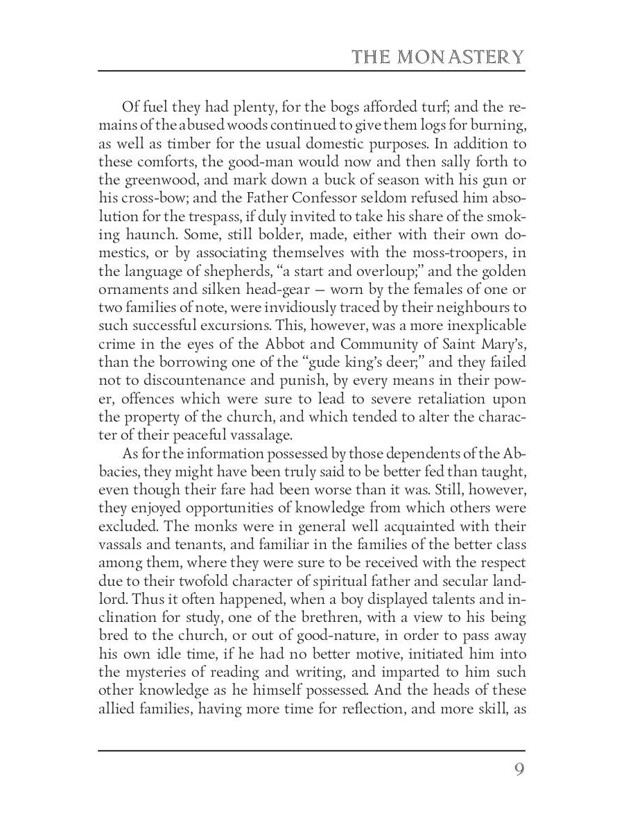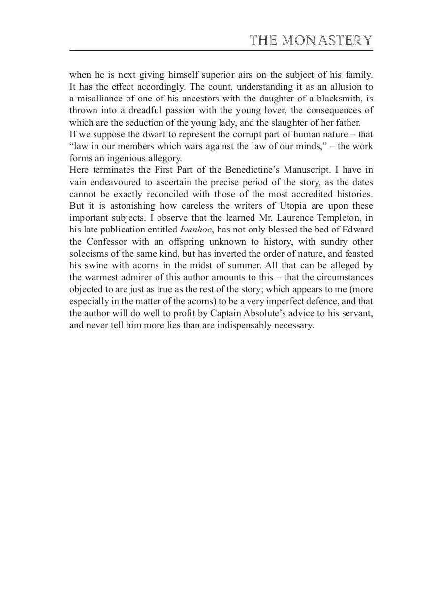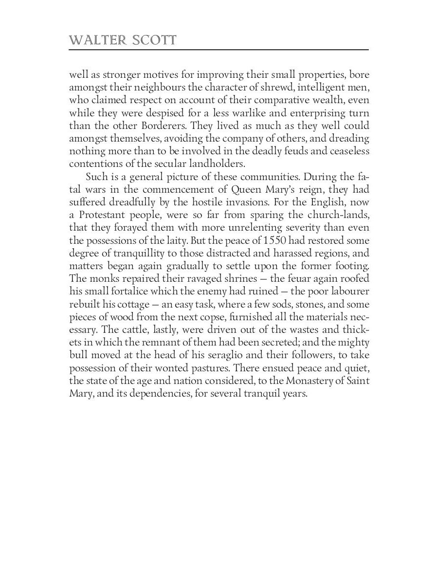 Walter Scott (1771-1832) was a Scottish historical novelist, poet, and playwright. Although he was an advocate and legal administrator by profession, Scott is most famous for his great literary works and activities in the Royal Highland Society. "The Monastery" is a historical novel that takes place during the Scottish Reformation in the middle of the sixteenth century. The wonderful love story between three heroes, Glendinning boys, and Mary Avenel, closely intersects with events in the country that threaten the very existence of the Monastery of Kennaquhair.
