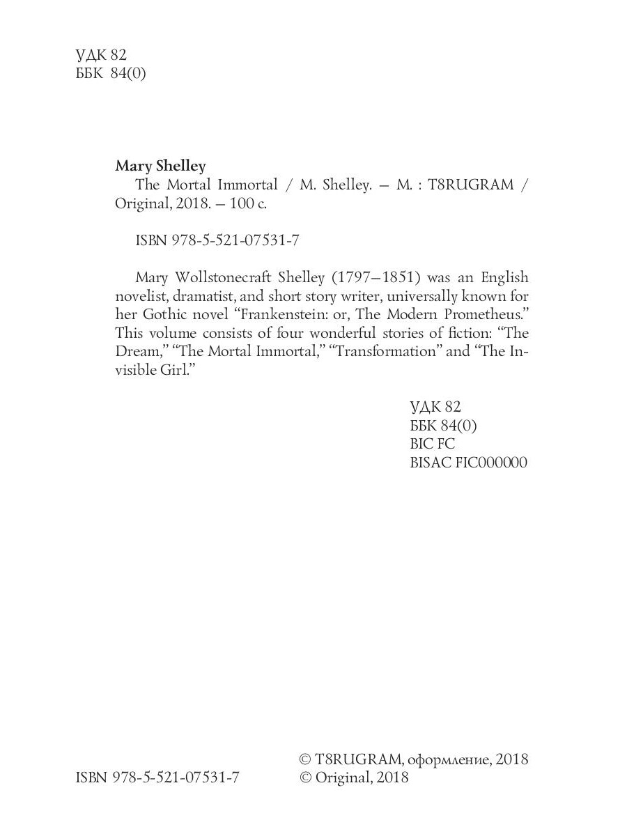 Mary Wollstonecraft Shelley (1797-1851) was an English novelist, dramatist, and short story writer, universally known for her Gothic novel "Frankenstein: or, The Modern Prometheus". This volume consists of four wonderful stories of fiction: "The Dream", "The Mortal Immortal", "Transformation" and "The Invisible Girl".