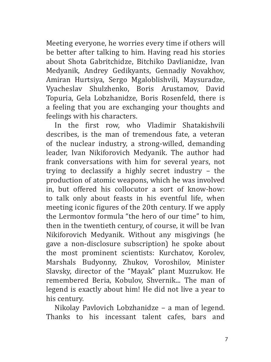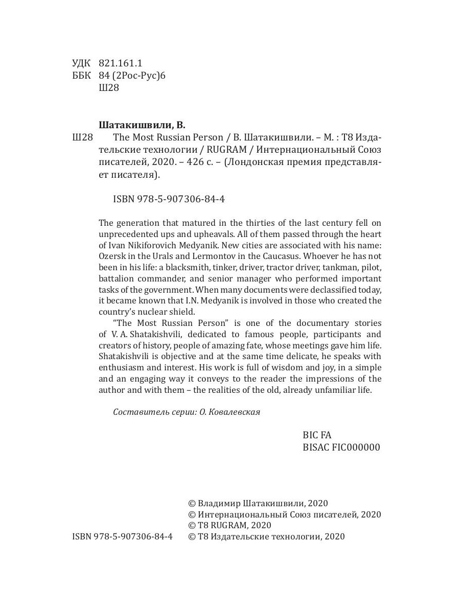 The generation that matured in the thirties of the last century fell on unprecedented ups and upheavals. All of them passed throught the heart of Ivan Nikiforovich Medyanik. New cities are associated with his name: Ozersk in the Urals and Lermontov in the Caucasus. Whoever he has not been in his life: a blacksmith, tinker, driver, tractor driver, tankman, pilot, battalion commander, and senior manager who performed importand tasks of the government. When many documents were declassified today, it became known that I.N. Medyanik is involved in those who created the country`s nuclear shield. "The Most Russian Person" is one of the documentary stories of V.A. Shatakishvilli, dedicated to famous people, participants and creators of history, people of amazing fate, whose meetings gave him life. Satakishvilli is objective and at the same time delicate, he speaks with enthusiasm and interest. His work is full of wisdom and joy, in a simple and an engaging way it conveys to the reader the impressions of the author and with them - the realities of the old, already unfamiliar life.| Издательство | Т8 RUGRAM |