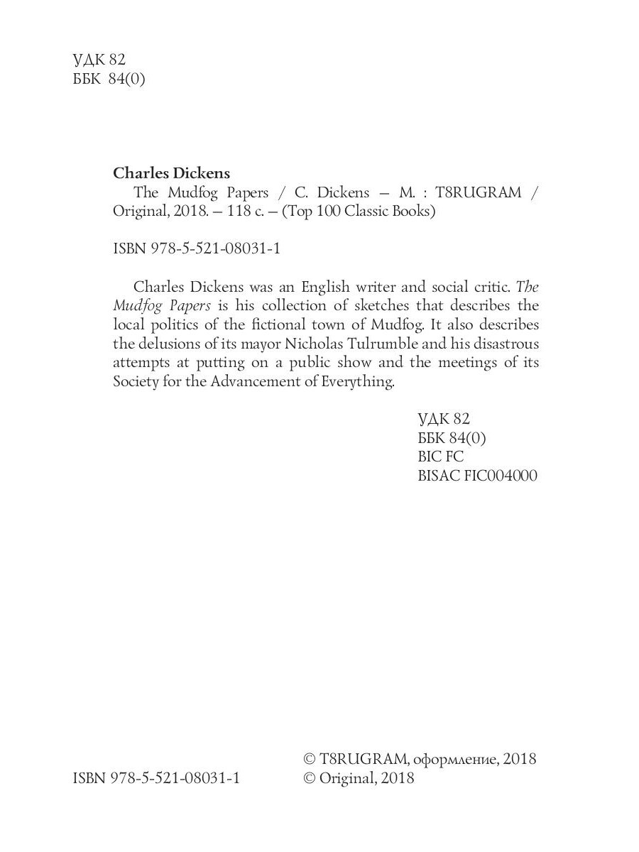 Charles Dickens was an English writer and social critic. The Mudfog Papers is his collection of sketches that describes the local politics of the fictional town of Mudfog. It also describes the delusions of its mayor Nicholas Tulrumble and his disastrous attempts at putting on a public show and the meetings of its Society for the Advancement of Everything.| Издательство | Т8 RUGRAM |