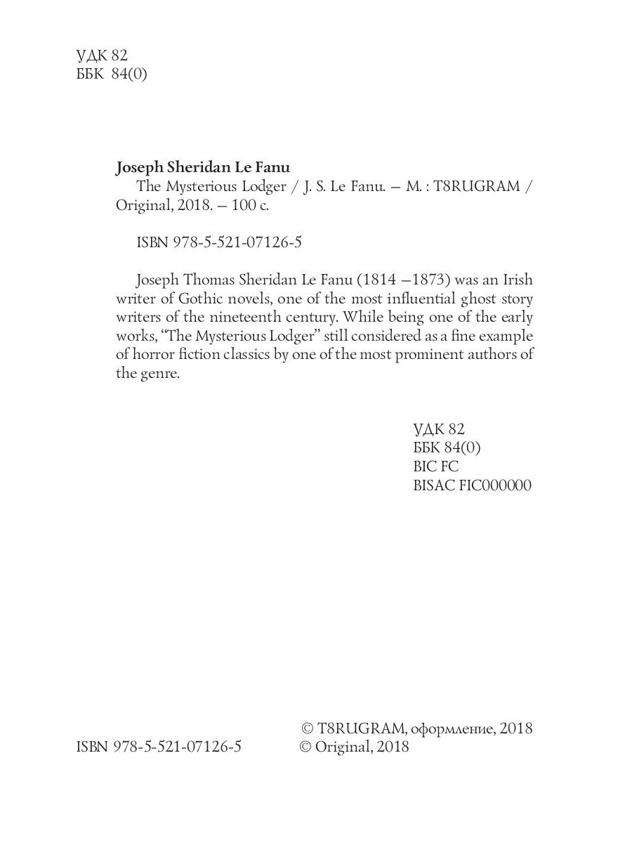 Joseph Thomas Sheridan Le Fanu (1814 -1873) was an Irish writer of Gothic novels, one of the most influential ghost story writers of the nineteenth century. While being one of the early works, "The Mysterious Lodger" still considered as a fine example of horror fiction classics by one of the most prominent authors of the genre.| Издательство | Т8 RUGRAM |