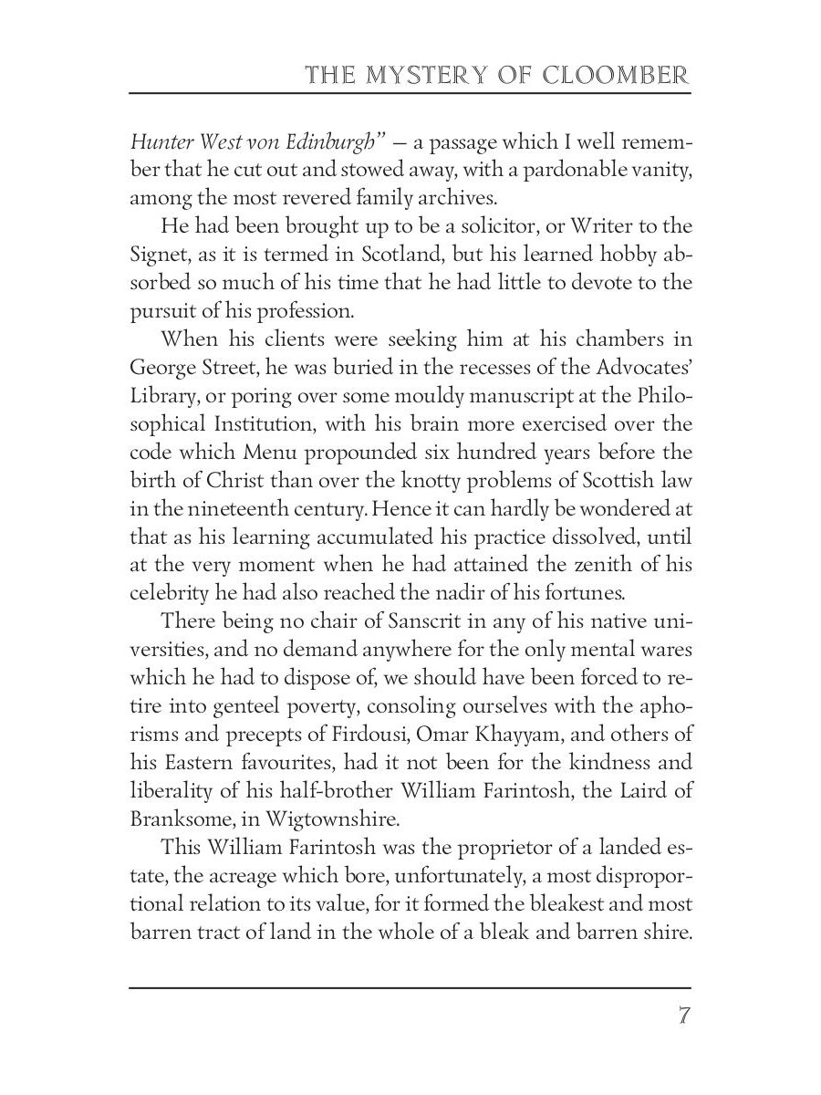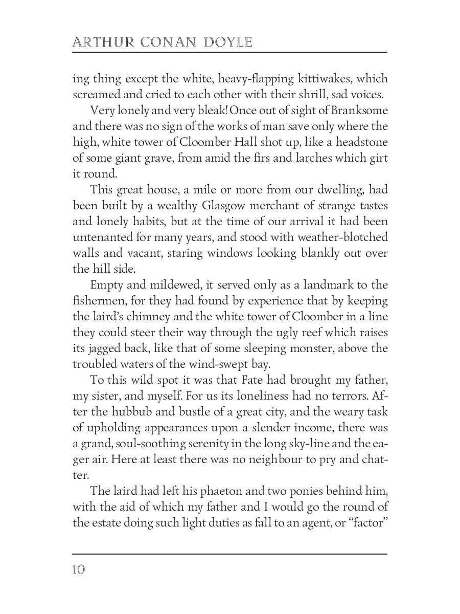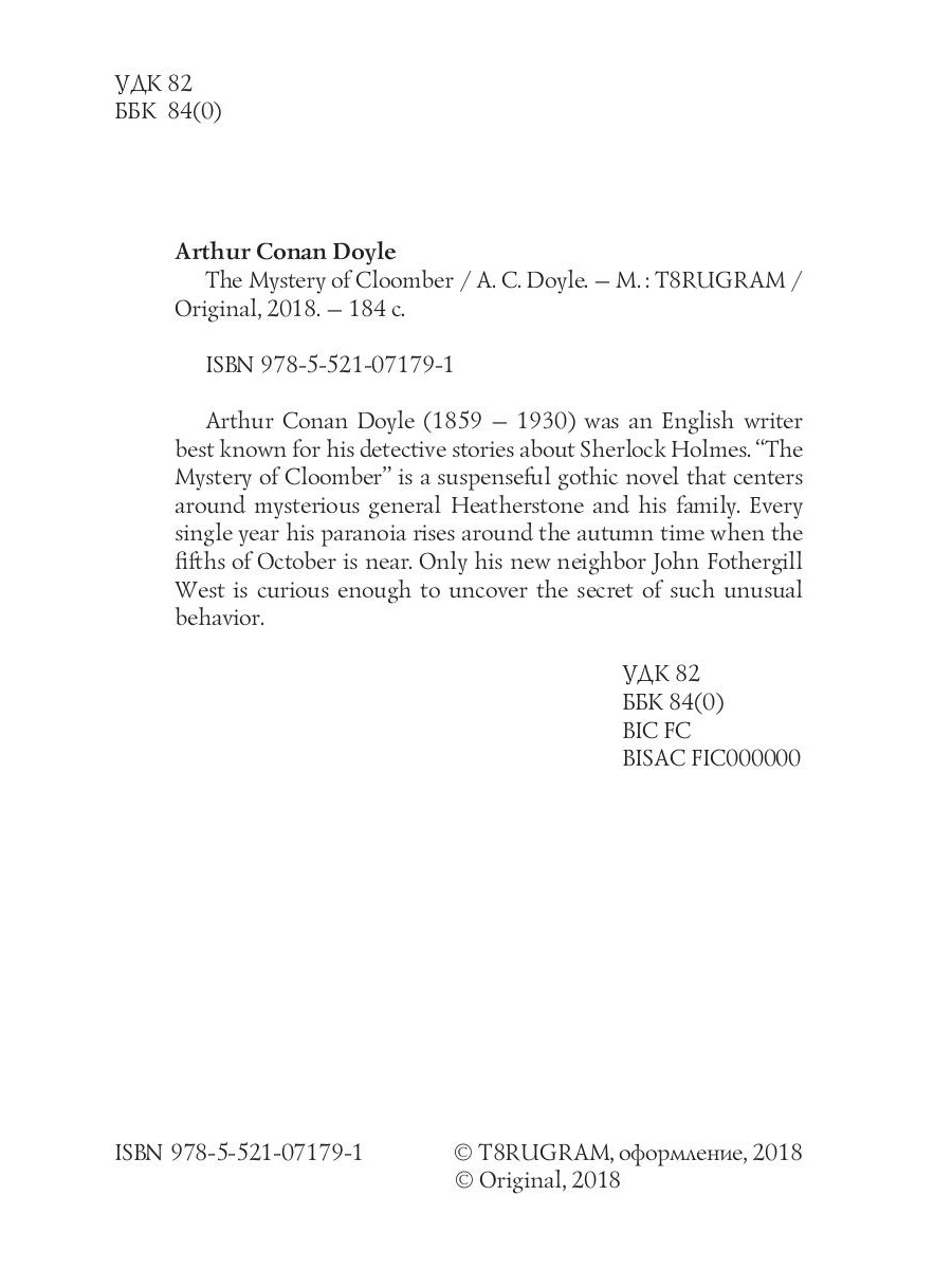 Arthur Conan Doyle (1859-1930) was an English writer best known for his detective stories about Sherlock Holmes. "The Mystery of Cloomber" is a suspenseful gothic novel that centers around mysterious general Heatherstone and his family. Every single year his paranoia rises around the autumn time when the fifths of October is near. Only his new neighbor John Fothergill West is curious enough to uncover the secret of such unusual behavior.