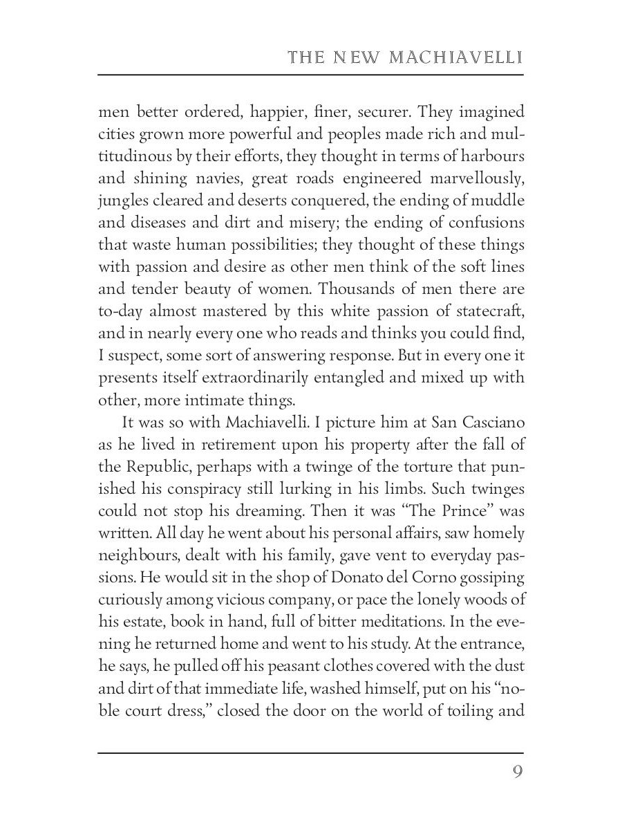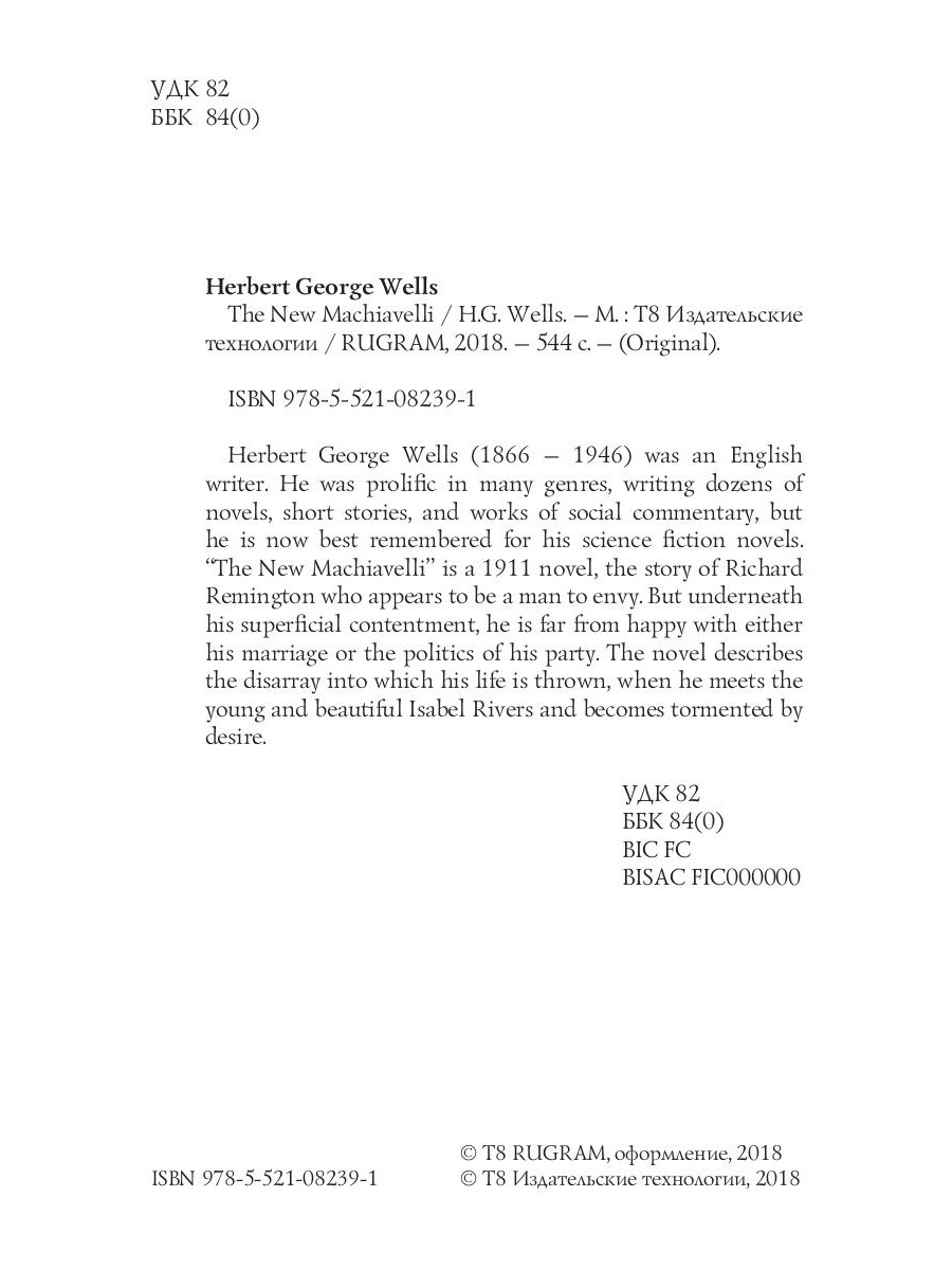 Herbert George Wells (1866-1946) was an English writer. He was prolific in many genres, writing dozens of novels, short stories, and works of social commentary, but he is now best remembered for his science fiction novels. "The New Machiavelli" is a 1911 novel, the story of Richard Remington who appears to be a man to envy. But underneath his superficial contentment, he is far from happy with either his marriage or the politics of his party. The novel describes the disarray into which his life is thrown, when he meets the young and beautiful Isabel Rivers and becomes tormented by desire.