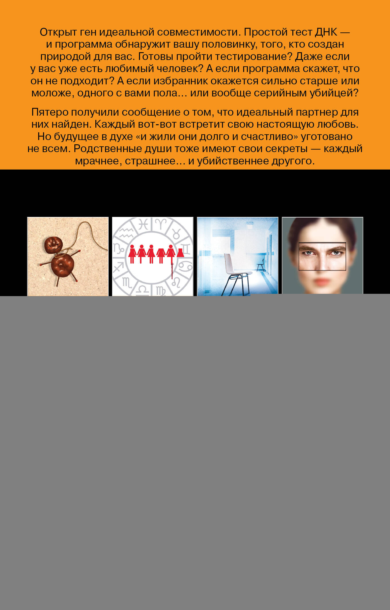 ЛУЧШИЙ ФАНТАСТИЧЕСКИЙ ТРИЛЛЕР-2018 ПО ВЕРСИИ WALL STREET JOURNAL. AMAZON BESTSELLER № 1. ХИТ NETFLIX. Взгляните на своего партнера и скажите честно: он (или она) - действительно тот самый ЕДИНСТВЕННЫЙ? Вы в этом уверены? Есть способ проверить! Открыт ген идеальной совместимости. Все, что требуется - простой тест ДНК, и программа сама обнаружит вашу вторую половинку, того, кто создан природой исключительно для вас, - как и вы для него. Интересно? Готовы пройти тестирование? Даже если у вас уже есть любимый человек? А что, если программа скажет, что он вам не подходит, - расстанетесь? Что, если ваш избранник окажется гораздо старше или моложе, одного с вами пола… или вообще серийный убийца? Пять разных людей получили сообщение о том, что идеальный партнер для них найден. Каждый вот-вот встретит свою настоящую любовь. Но будущее в духе «и жили они долго и счастливо» уготовано не всем. Родственные души тоже имеют свои секреты - каждый мрачнее, страшнее… и убийственнее другого. ------------------------------- «Не просто психологический триллер, а как будто очень длинный новый эпизод "Черного зеркала". И написано с таким знанием дела, что поневоле думаешь: такое может и на самом деле произойти». - Peterborough Telegraph «Сплошное удовольствие читать такую ни на что не похожую, умную, заставляющую задуматься книгу». - Питер Джеймс «Мрачный роман для посмеивающихся над Днем святого Валентина». - The New York Post «Чтение, влекущее в темные глубины. Есть что переосмыслить». - The Sun «Шок на каждой следующей странице». - Wall Street Journal «Да уж, пути "настоящей любви" более чем неисповедимы… Это завораживает». - Library Journal «Увлекательный и крайне правдоподобный триллер Маррса поднимает интересные вопросы о нашем будущем, где наука станет играть первую скрипку». - Booklist «Маррс способен заинтриговать одновременно и романтиков, и скептиков». - Kirkus Reviews «В романе Маррса пятеро независимых героев получили уведомления о том, что они "совпали". Каждый из них скоро встретит свою настоящую любовь. Но "долго и счастливо" не всем гарантировано. Потому что даже у родственных душ есть секреты мрачнее, страшнее... и убийственнее, чем можно представить». - Наталья Ломыкина, литературный обозреватель FORBES| Издательство | ООО "Издательство "Эксмо" |