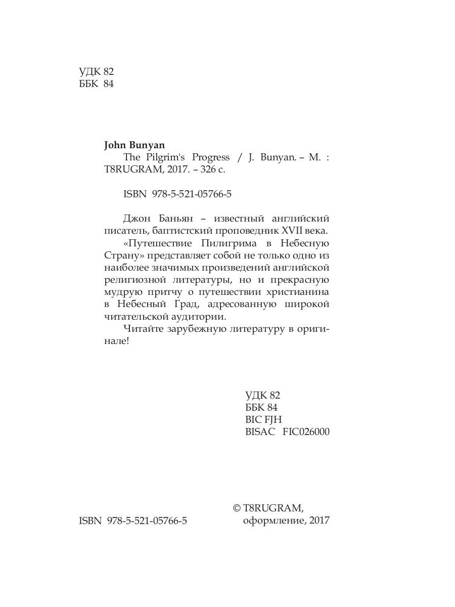 Джон Баньян - известный английский писатель, баптистский проповедник XVII века. «Путешествие Пилигрима в Небесную Страну» представляет собой не только одно из наиболее значимых произведений английской религиозной литературы, но и прекрасную мудрую притчу о путешествии христианина в Небесный Град, адресованную широкой читательской аудитории. Читайте зарубежную литературу в оригинале!| Издательство | Т8 RUGRAM |