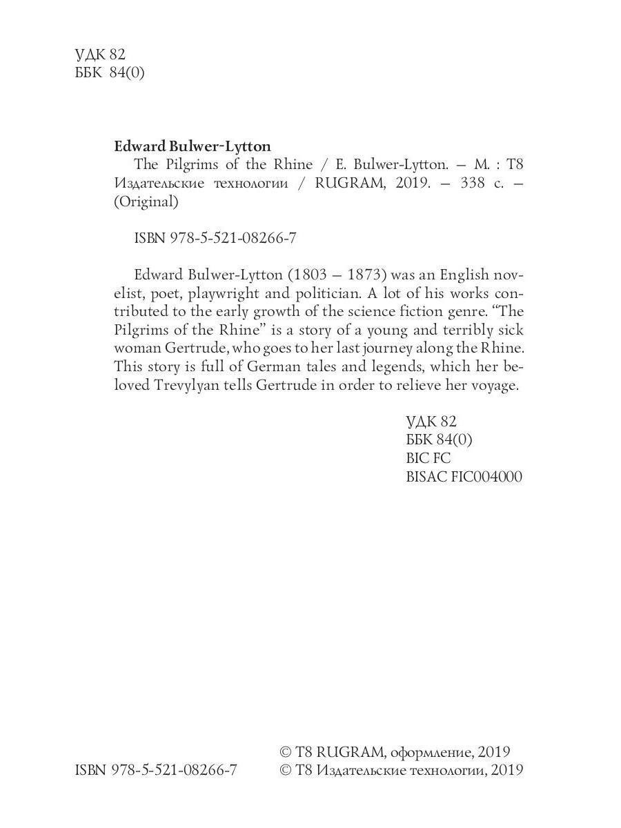 Edward Bulwer-Lytton (1803 - 1873) was an English novelist, poet, playwright and politician. A lot of his works contributed to the early growth of the science fiction genre. "The Pilgrims of the Rhine" is a story of a young and terribly sick woman Gertrude, who goes to her last journey along the Rhine. This story is full of German tales and legends, which her beloved Trevylyan tells Gertrude in order to relieve her voyage.| Издательство | Т8 RUGRAM |
