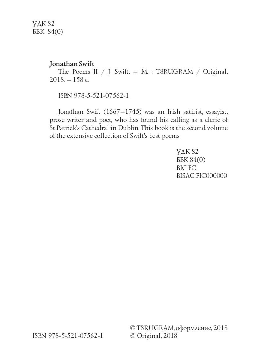 Jonathan Swift (1667-1745) was an Irish satirist, essayist, prose writer and poet, who has found his calling as a cleric of St Patrick's Cathedral in Dublin. This book is the second volume of the extensive collection of Swift's best poems.