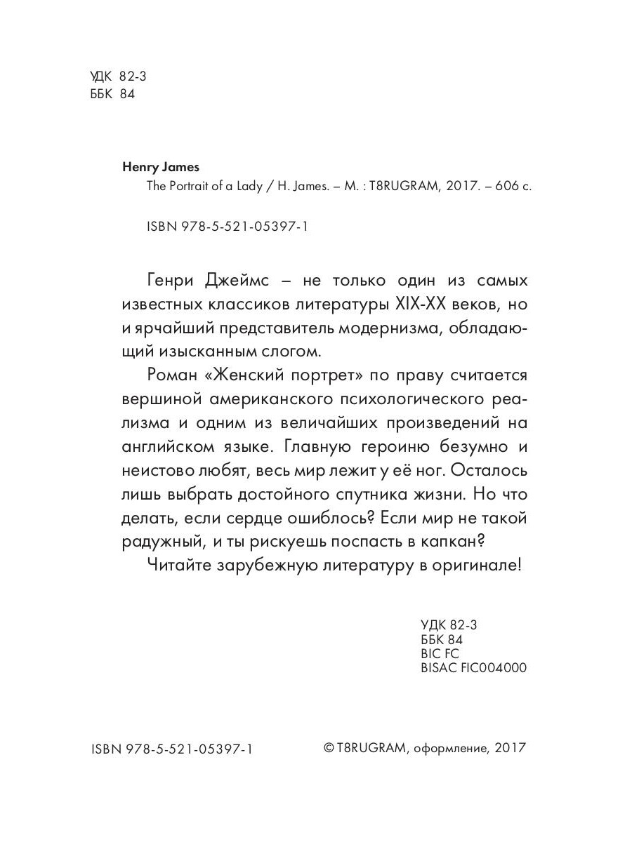 Роман «Женский портрет» по праву считается вершиной американского психологического реализма и одним из величайших произведений на английском языке. Главную героиню безумно и неистово любят, весь мир лежит у её ног. Осталось лишь выбрать достойного спутника жизни. Но что делать, если сердце ошиблось? Если мир не такой радужный, и ты рискуешь попасть в капкан?
