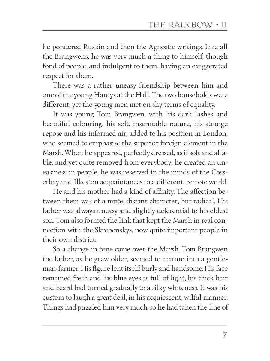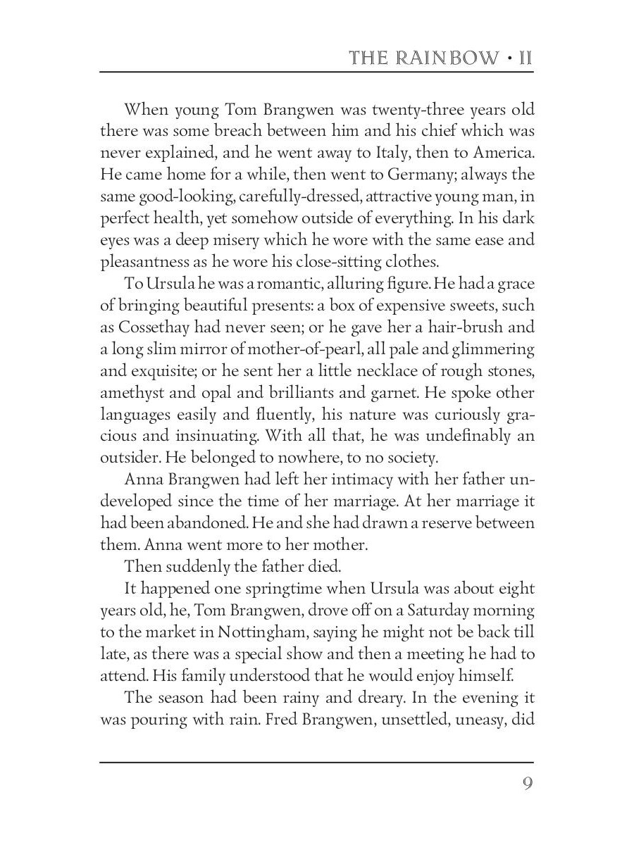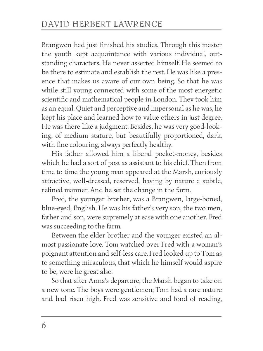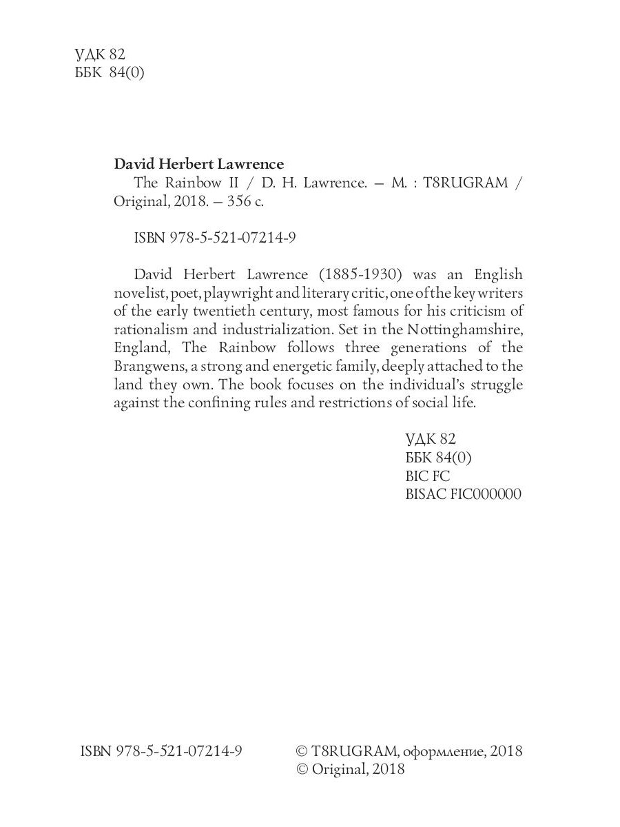 David Herbert Lawrence (1885-1930) was an English novelist, poet, playwright and literary critic, one of the key writers of the early twentieth century, most famous for his criticism of rationalism and industrialization. Set in the Nottinghamshire, England, The Rainbow follows three generations of the Brangwens, a strong and energetic family, deeply attached to the land they own. The book focuses on the individual's struggle against the confining rules and restrictions of social life.| Издательство | Т8 RUGRAM |