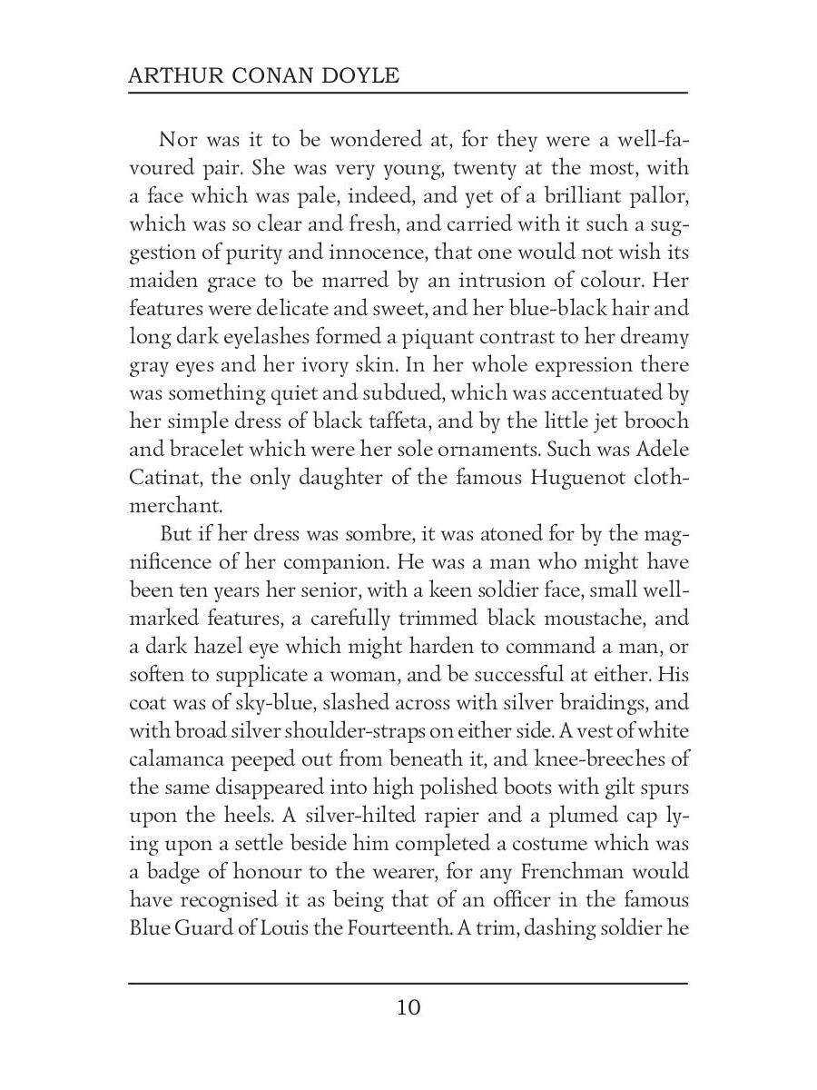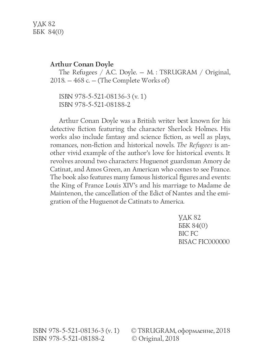Arthur Conan Doyle was a British writer best known for his detective fiction featuring the character Sherlock Holmes. His works also include fantasy and science fiction, as well as plays, romances, non-fiction and historical novels. The Refugees is another vivid example of the author's love for historical events. It revolves around two characters: Huguenot guardsman Amory de Catinat, and Amos Green, an American who comes to see France. The book also features many famous historical figures and events: the King of France Louis XIV's and his marriage to Madame de Maintenon, the cancellation of the Edict of Nantes and the emigration of the Huguenot de Catinats to America