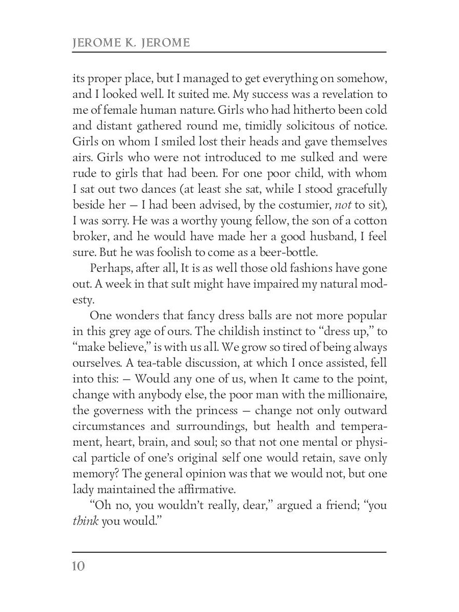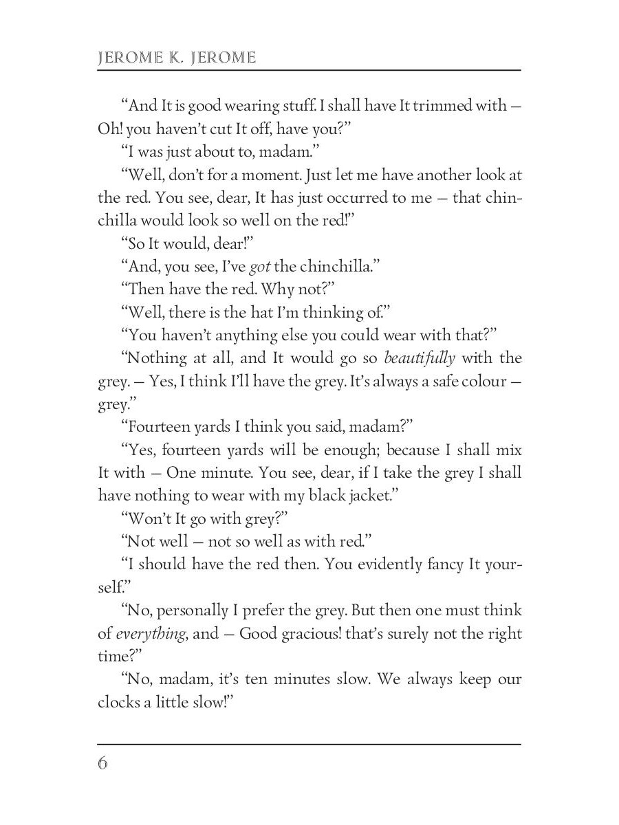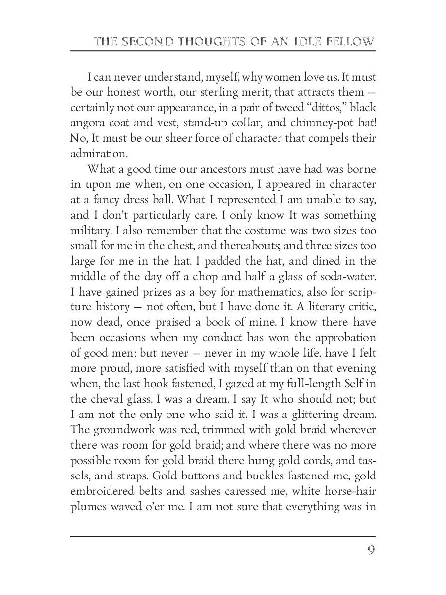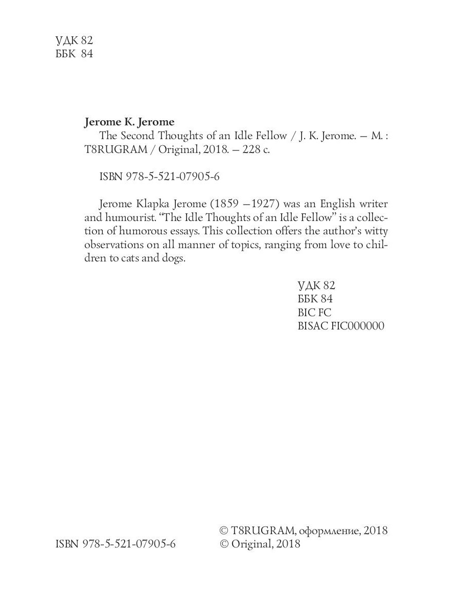 Jerome Klapka Jerome (1859 -1927) was an English writer and humourist. «The Idle Thoughts of an Idle Fellow» is a collection of humorous essays. This collection offers the author's witty observations on all manner of topics, ranging from love to children to cats and dogs.