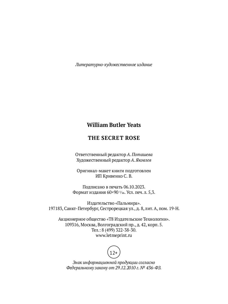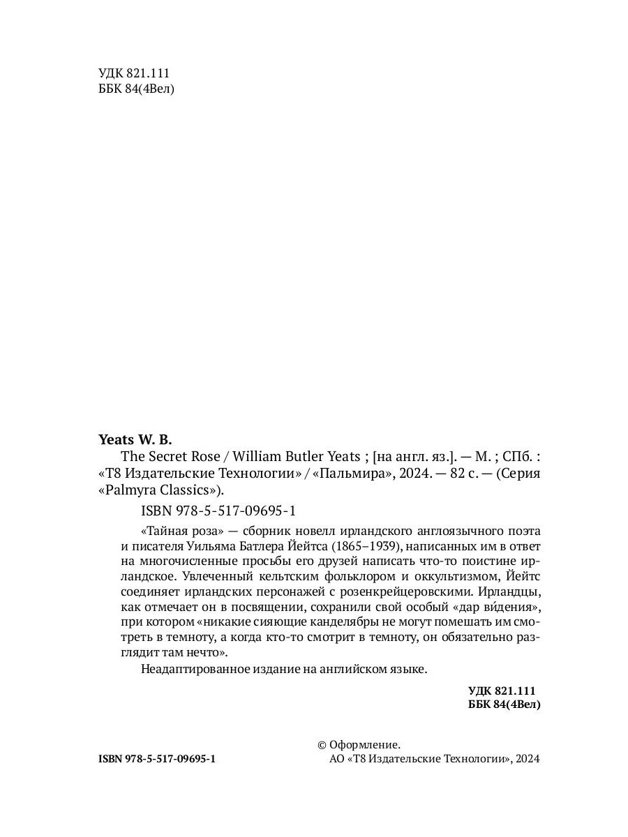 "Тайная роза" - сборник новелл ирландского англоязычного поэта и писателя Уильяма Батлера Йейтса (1865-1939), написанных им в ответ на многочисленные просьбы его друзей написать что-то поистине ирландское. Увлеченный кельтским фольклором и оккультизмом, Йейтс соединяет ирландских персонажей с розенкрейцеровскими. Ирландцы, как отмечает он в посвящении, сохранили свой особый "дар видения", при котором "никакие сияющие канделябры не могут помешать им смотреть в темноту, а когда кто-то смотрит в темноту, он обязательно разглядит там нечто". Неадаптированное издание на английском языке.