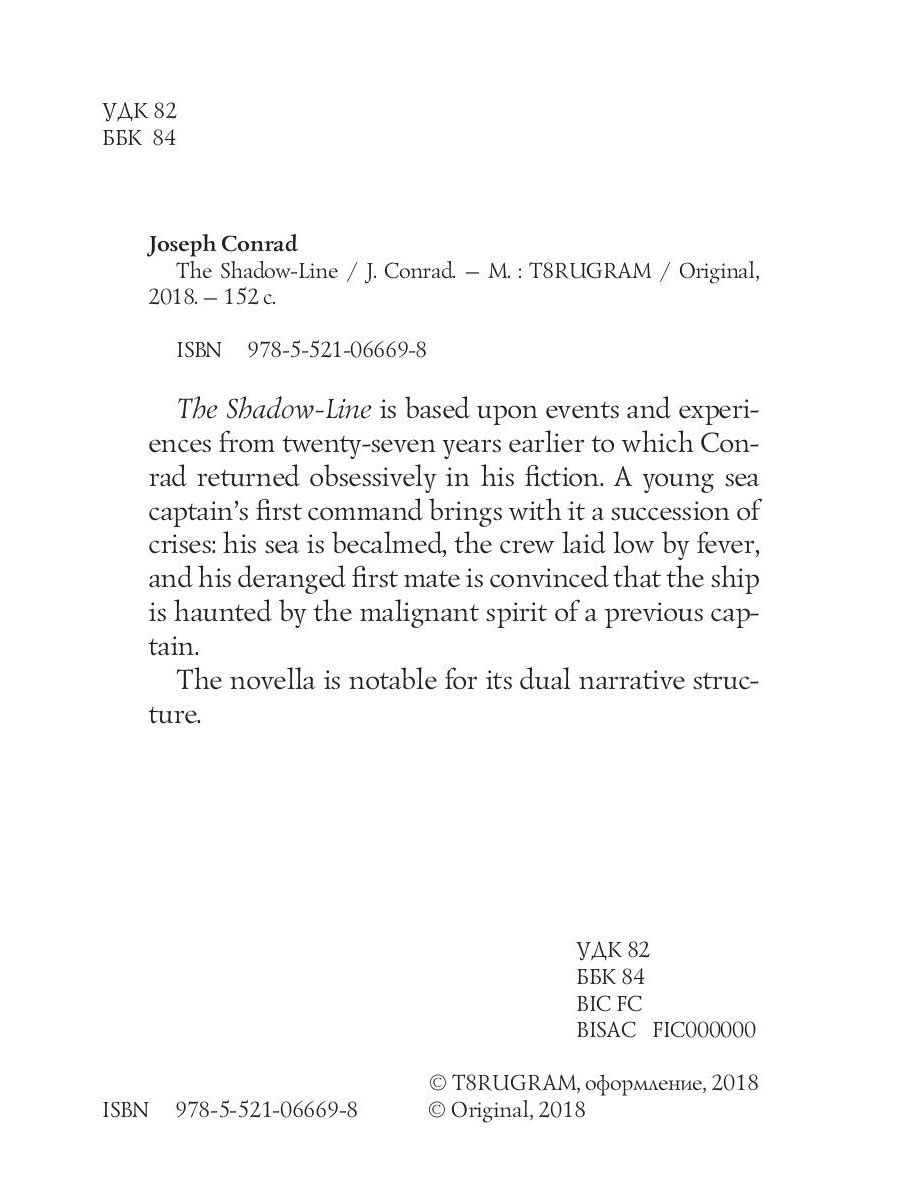 The Shadow-Line is based upon events and experiences from twenty-seven years earlier to which Conrad returned obsessively in his fiction. A young sea captain's first command brings with it a succession of crises: his sea is becalmed, the crew laid low by fever, and his deranged first mate is convinced that the ship is haunted by the malignant spirit of a previous captain. The novella is notable for its dual narrative structure.| Издательство | Т8 RUGRAM |
