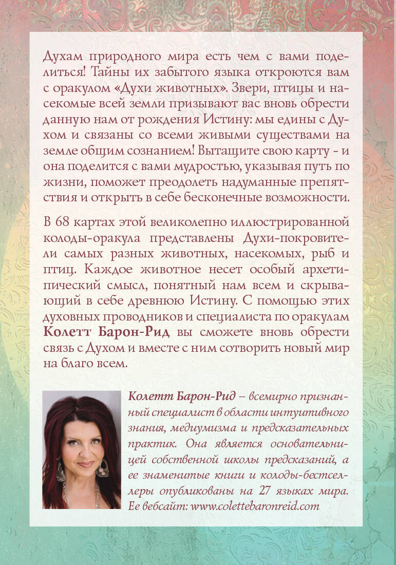 Колода-оракул «Духи животных» от Колетт Барон-Рид, автора знаменитого The Good Tarot и соавтора «Оракула Шамана-мистика», это послание мира природы всем нам: мы едины с Духом и связаны со всеми живыми существами на земле общим сознанием! The Spirit Animal Oracle - это: • Мировой бестселлер, собравший более 4700 отзывов на Amazon. • Красочная колода из 68 карт, в которой представлены Духи-покровители в виде самых разных животных, насекомых, рыб и птиц, иллюстрированная художницей Дженой делла Гротталья. • Руководство к колоде с подробными толкованиями прямых и перевернутых карт и правилами работы с ними. Вытащите свою карту - и она поделится с вами мудростью, указывая путь по жизни, поможет преодолеть надуманные препятствия и открыть в себе бесконечные возможности. Колетт Барон-Рид - автор знаменитого The Good Tarot и соавтор «Оракула Шамана-мистика», всемирно признанный специалист в области интуитивного знания, медиумизма и предсказательных практик. Она является основательницей собственной школы предсказаний, а ее знаменитые книги и колоды-бестселлеры опубликованы на 27 языках мира.| Издательство | ООО "Издательство "Эксмо" |