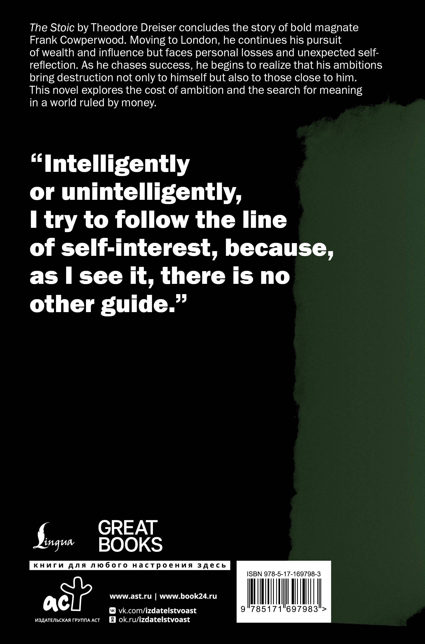 "Стоик" - последний роман из трилогии о судьбе Фрэнка Каупервуда, начатой в книгах "Финансист" и "Титан". В этом произведении Теодор Драйзер завершает историю амбициозного предпринимателя, для которого успех и деньги всегда были главными ориентирами. Фрэнк Каупервуд, талантливый финансист и магнат, добивается нового уровня богатства, покоряя Лондон. Однако его путь к вершине сопровождается не только триумфами, но и сложностями - разочарованиями и осознанием собственных границ. Обретет ли он истинное счастье или же останется пленником своих стремлений? Роман "Стоик" - это не только остросюжетная история становления и падения одного человека, но и глубокое размышление о смысле жизни, цене успеха и неизбежности судьбы. Насладитесь историей Фрэнка Каупервуда на языке оригинала без перевода и адаптации.| Издательство | Издательство "АСТ" |