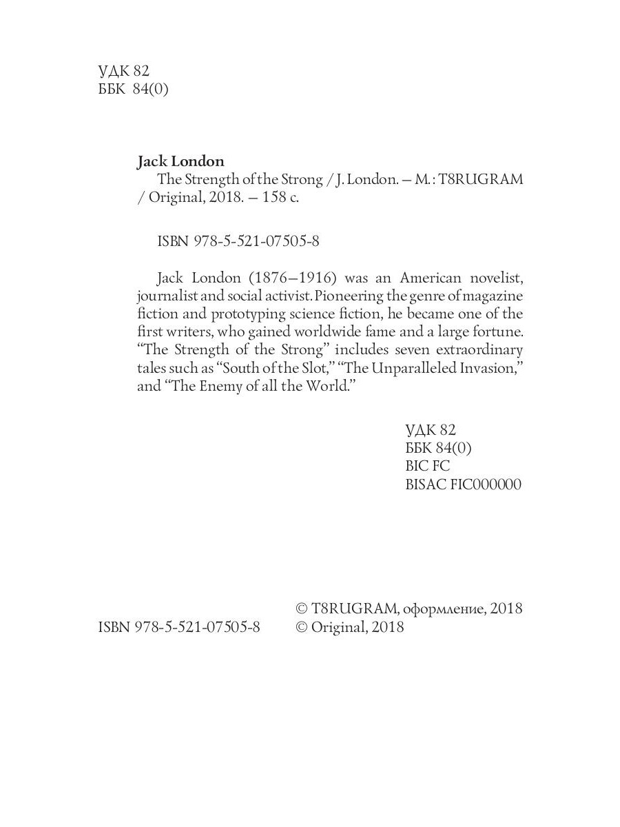 Jack London (1876-1916) was an American novelist, journalist and social activist. Pioneering the genre of magazine fiction and prototyping science fiction, he became one of the first writers, who gained worldwide fame and a large fortune. "The Strength of the Strong" includes seven extraordinary tales such as "South of the Slot", "The Unparalleled Invasion" and "The Enemy of All the World".
