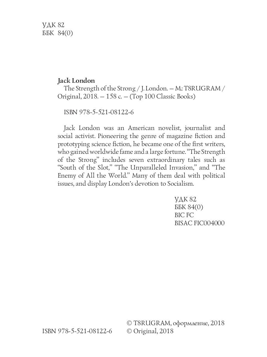 Jack London was an American novelist, journalist and social activist. Pioneering the genre of magazine fiction and prototyping science fiction, he became one of the first writers, who gained worldwide fame and a large fortune. "The Strength of the Strong" includes seven extraordinary tales such as "South of the Slot," "The Unparalleled Invasion," and "The Enemy of All the World." Many of them deal with political issues, and display London's devotion to Socialism.| Издательство | Т8 RUGRAM |
